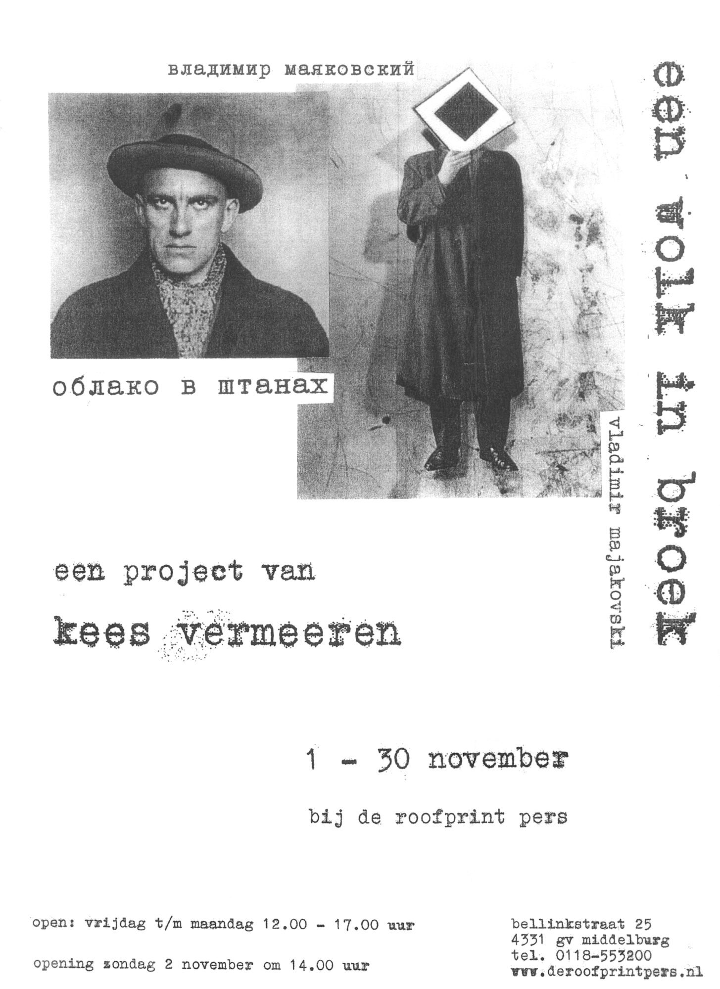 In een tentoonstelling met posters, (kunstenaars)boeken, poëzie, teksten en beelden geeft Kees Vermeeren ons zijn visie op de dichter (& multitalent) van de russische revolutie, Vladimir Majakovski (1893 – 1930). Hij verbindt Majakovski en zijn radicale verbeelding met onze tijd, waarin kunst weer onder druk staat en opnieuw de vraag oproept hoe schoonheid, waarheid en maatschappelijke betrokkenheid zich met elkaar verhouden.