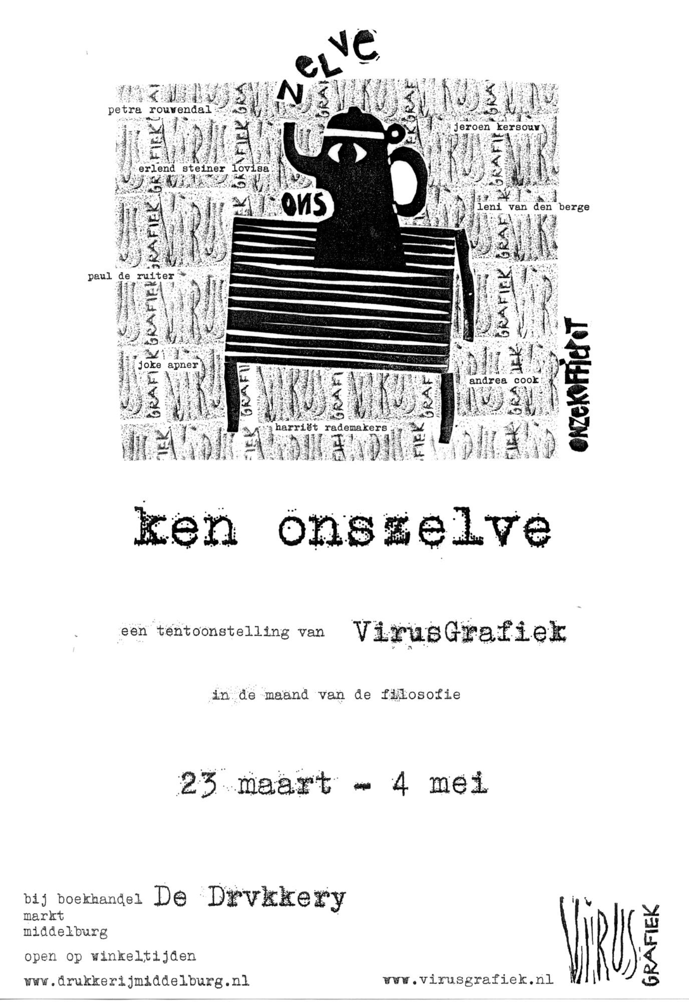 Acht grafici van VirusGrafiek (platform voor de grafische kunsten in Zeeland) maakten nieuw werk voor de tentoonstelling ‘Ken onszelve’ in boekhandel De Drvkkery in Middelburg. Te zien tijdens de maand van de filosofie. Expositiedata: 23 maart – 4 mei. Deelnemers: Andrea Cook, Erlend Steiner Lovisa, Harriët Rademakers, Jeroen Kersouw, Joke Apner, Leni van den Berge, Paul de Ruiter en Petra Rouwendal.
