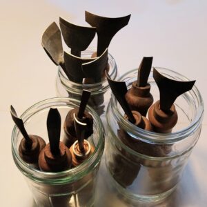 2 houten bengels om een houten liggende pers aan te spannen
