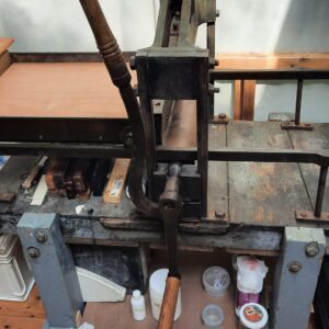 Nieuwe boekenpers en oude lijmpot voor beenderlijm