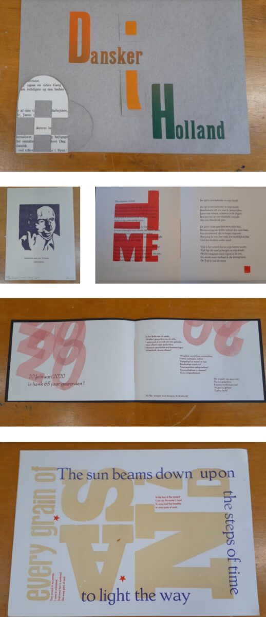 Ik heb thuis een FAG SwissProof pers en een Korrex proefpers, maar ik druk ook in het Grafisch Centrum Groningen, Warmoesstraat om andere drukkers te treffen. Meest typografie en sporadisch houtdruk. Alleen voor mijn plezier.