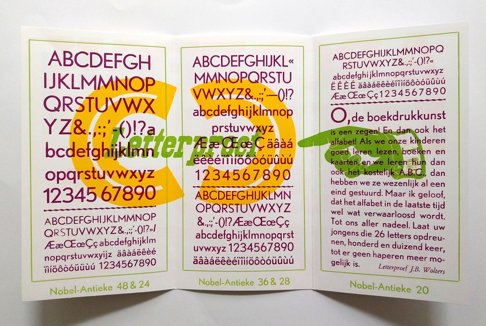 Annonce, Arsis, Bodoni, Folio, Garamont, Gill, Iris, Kabel, Libra, Nobel, Olga, Steenschrift, Weiss, houten letterVethgedrukt