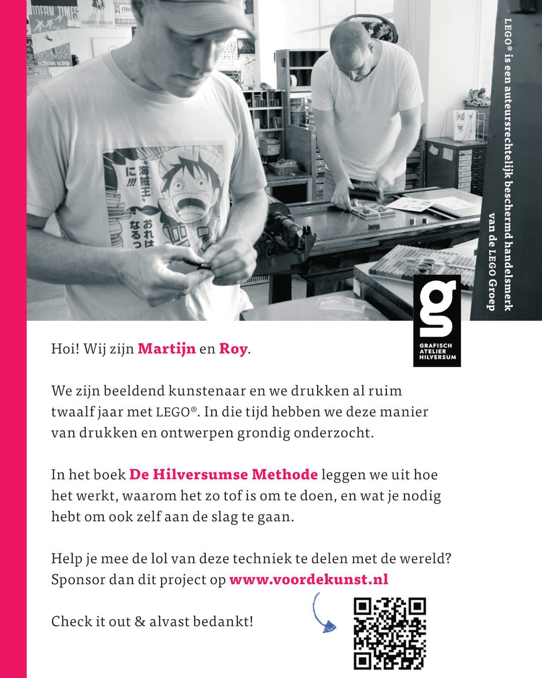 1. Als bestuur van Grafisch Atelier Hilversum zijn we enorm trots op het project De Hilversumse Methode — Het tweede boek over drukken met LEGO door Roy en Martijn. Het wordt ongetwijfeld weer een bijzondere publicatie vol vakmanschap, liefde voor het drukken, grafische traditie èn innovatie.