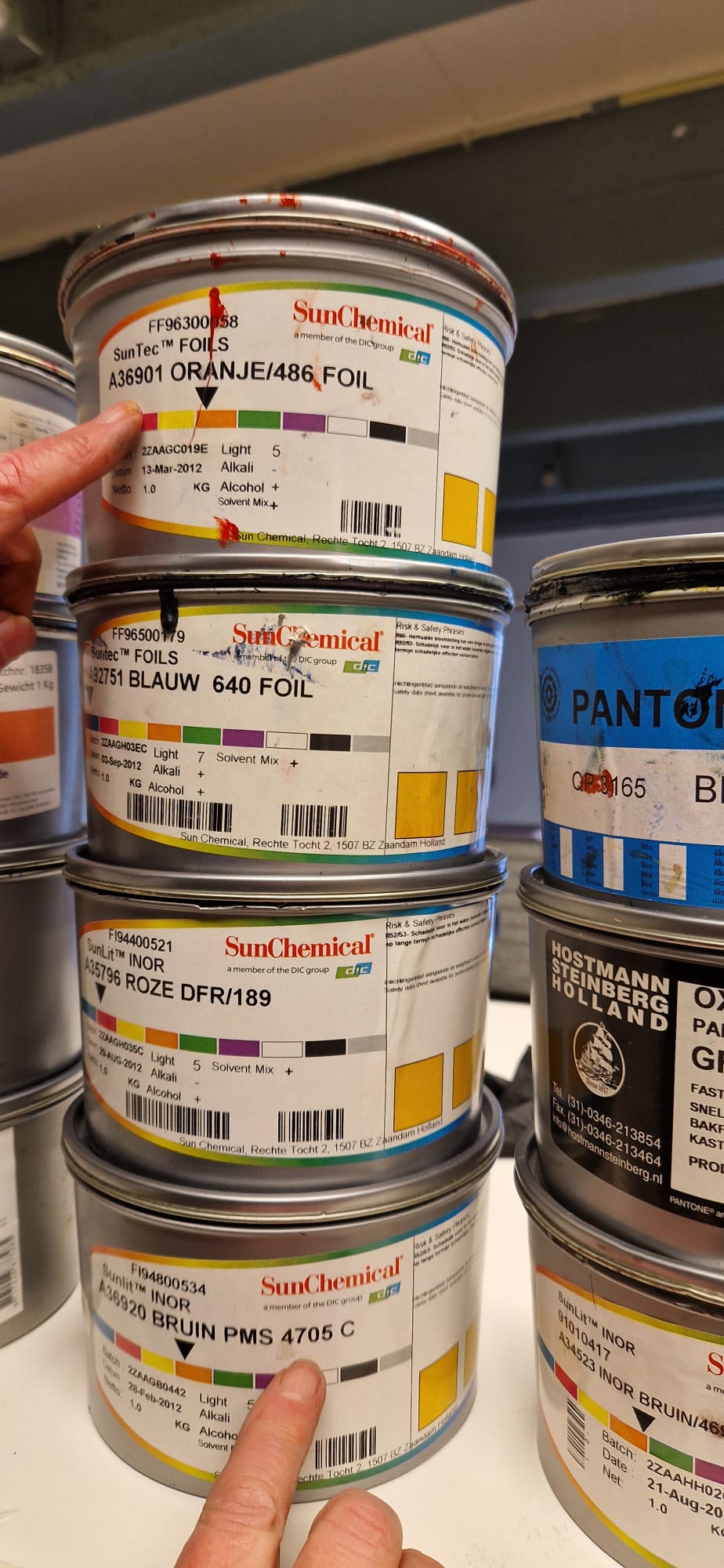 In het Drukkerijmuseum zijn we inkten aan het uitzoeken. Er staan nogal wat soorten schenkingen!