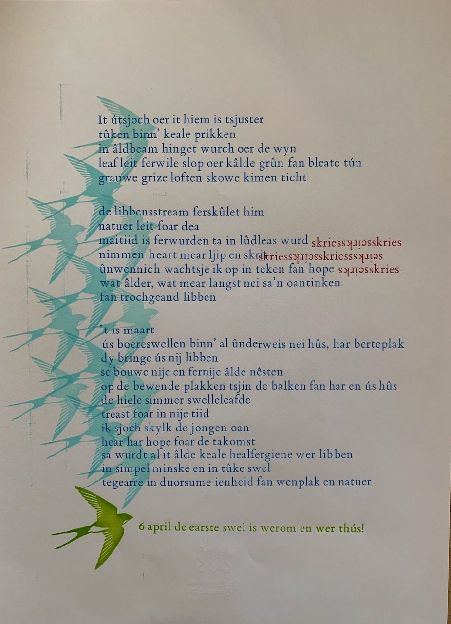 Vandaag, 6 april 2026 zagen we de eerste boerenzwaluw weer bij ons (en zijn) huis (het mannerte komt altijd het eerst). Toen kon het Swellefers, dat al klaar lag, worden afgemaakt en afgedrukt.