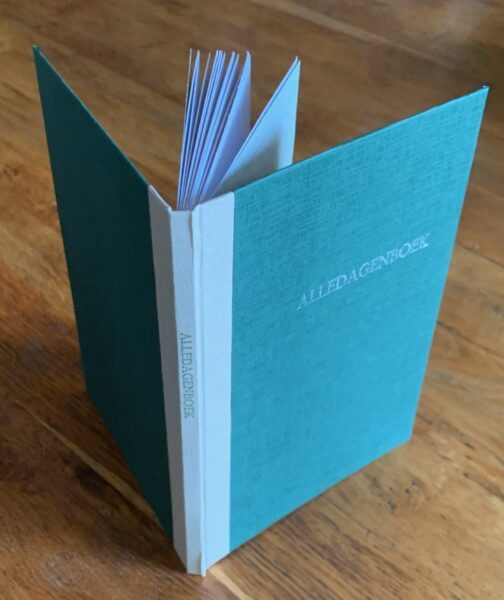 Mocht er iets zijn vergeten dan is er een bladzijde voor addenda en vergissen kan worden verbeterd op de bladzijde voor errata. Een bijzondere uitgave dus. Zoiets drukte De Hynsteblom in de afgelopen meer dan vijftig jaar nog nooit. Kom op zaterdag 25 oktober (zondag ben ik er niet) naar de Drukkunstbeurs in Amersfoort, kijk naar wat ik nog heb en reserveer nu alvast uw exemplaar van het Alledagenboek!