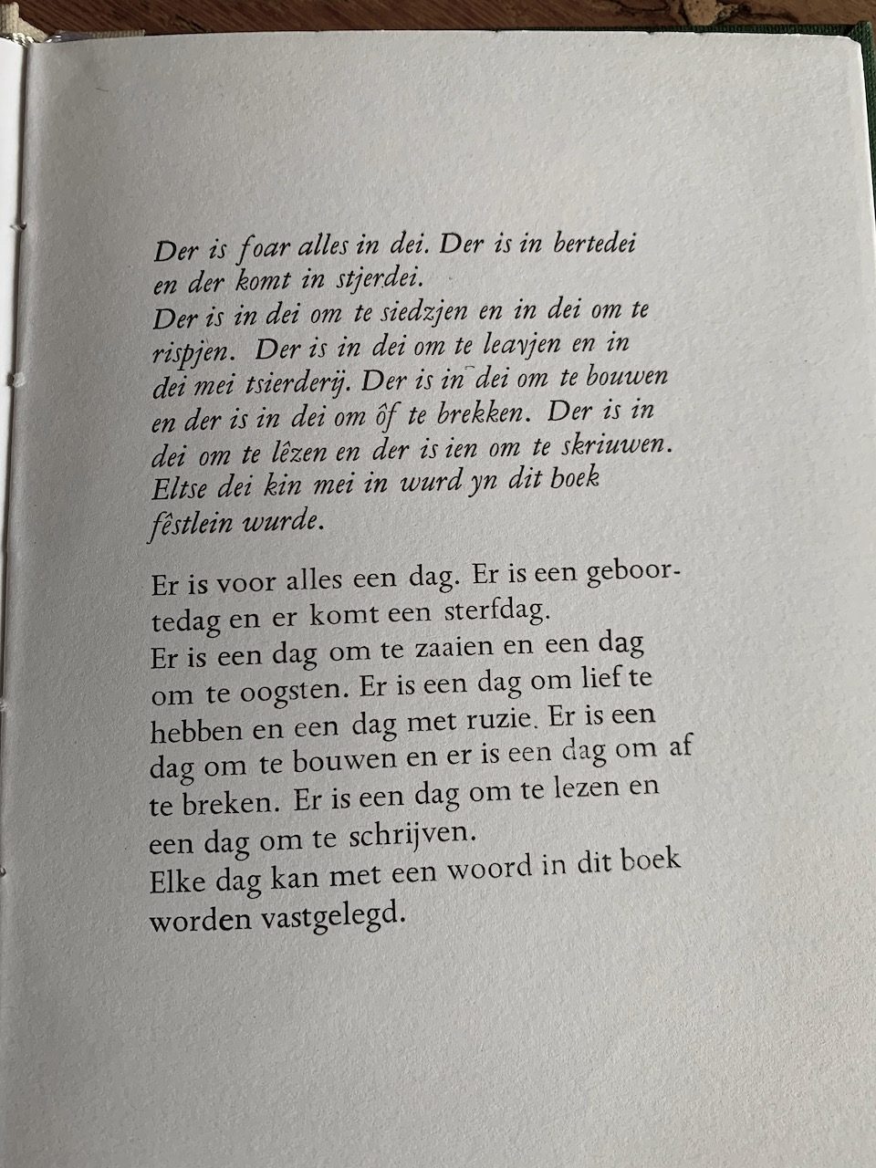 Voor alles is een dag, u weet het. Er is een dag om te lezen en er is een dag om te schrijven. In dit boek kan elke dag met een woord of een regel worden vastgelegd. Is het dus een Dagboek of een Deiboek? Het is een alledagenboek met een toelichting (op één bladzijde) in twee talen. Voor elke datum van een jaar is een regel gereserveerd om wat op te schrijven. Dit boekje daagt uit om het leven vast te houden. Elke maand (de de Friese aanduiding) wordt ingeleid door een aan die maand eigen plaatje dat in een passende kleur is gedrukt.