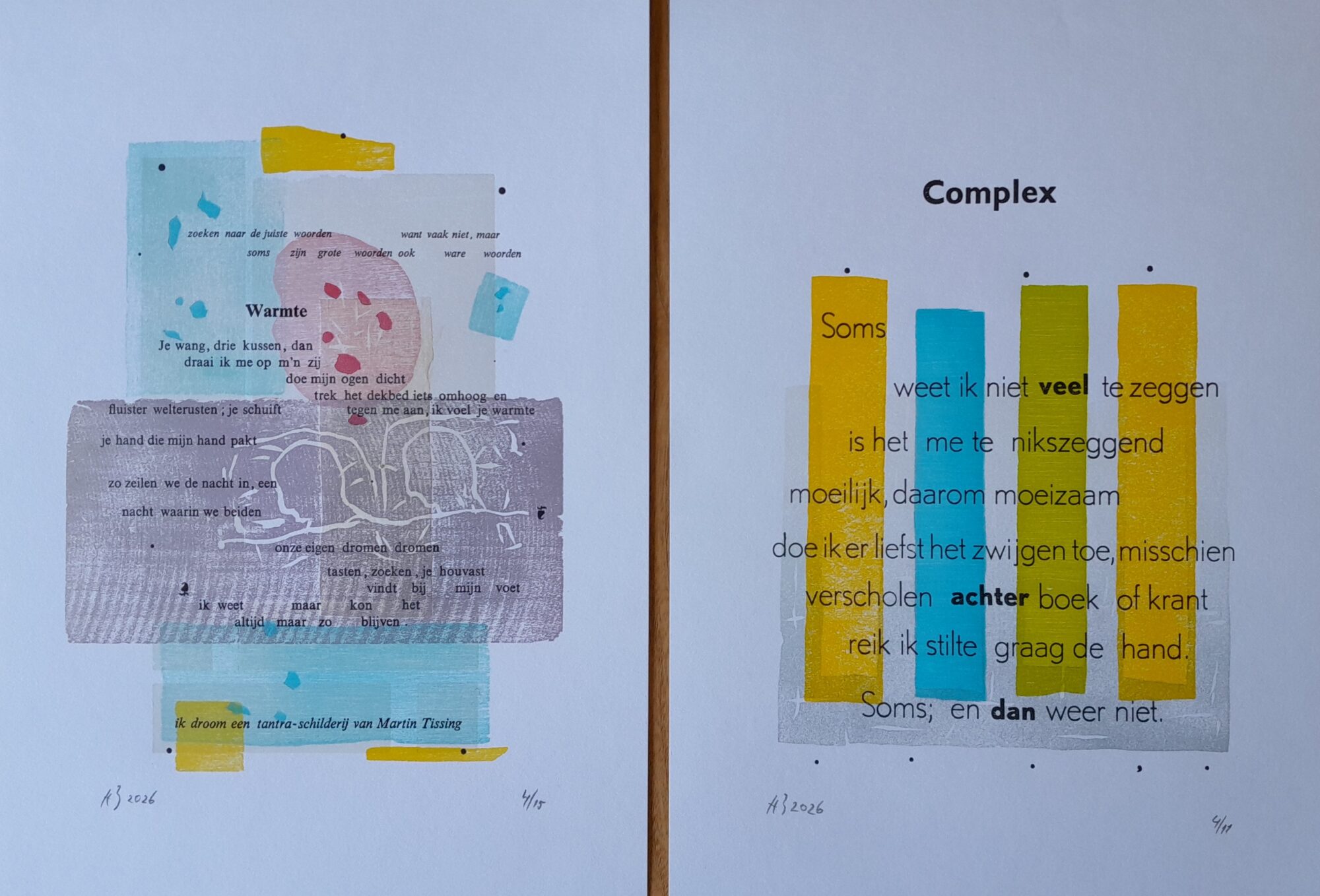 Ook al is er een suggestie van voorjaar, zonder in somberheid te vervallen mag worden gesteld dat het leven soms ingewikkeld is. Soms ook is het in wezen eenvoudig en gaat het zoals het al eeuwenlang tussen mensen gaat. Tot op zekere hoogte getuigen de recente druksels ‘Complex’ en ‘Warmte’ hiervan.