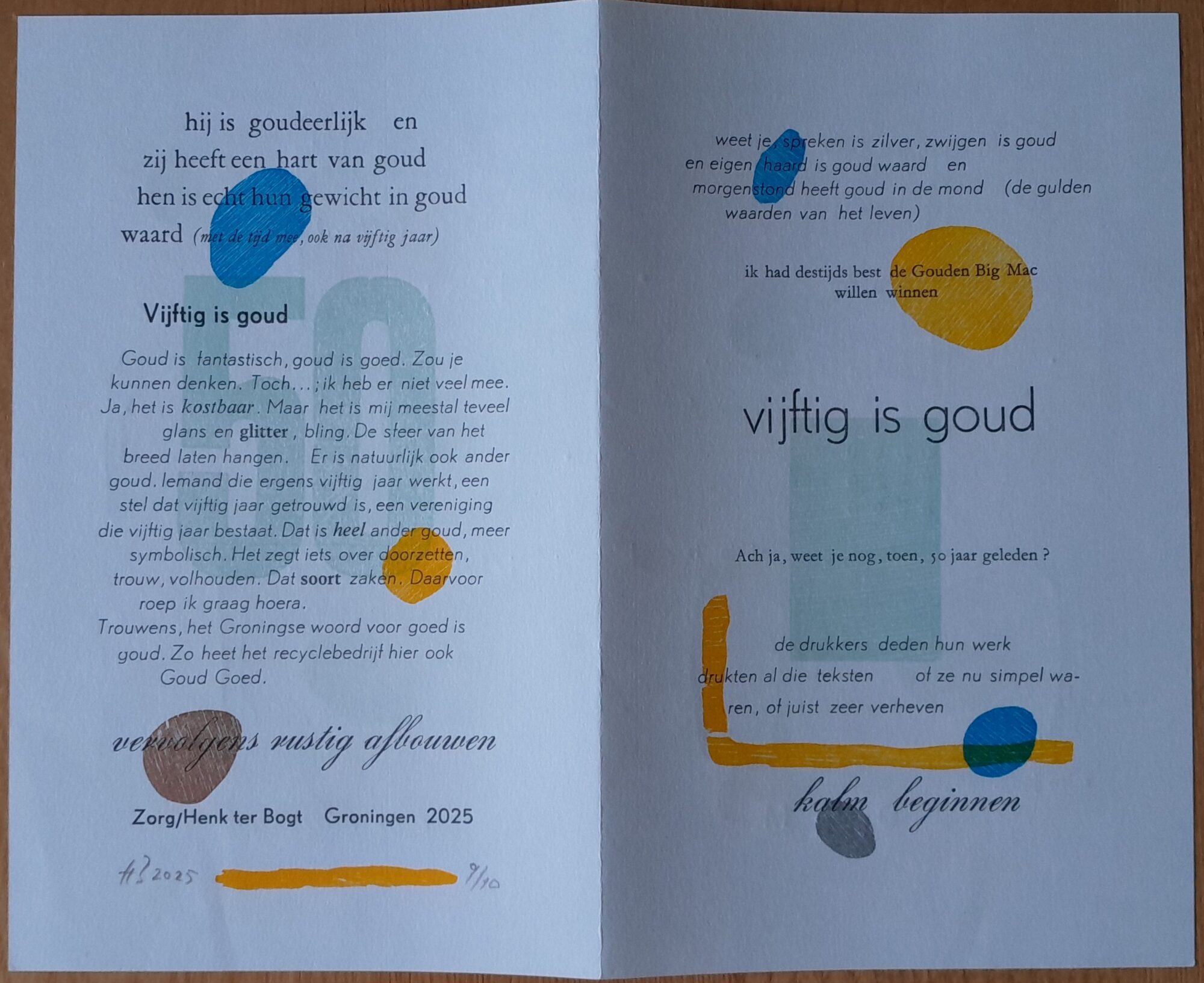Verder zijn nog enkele exemplaren beschikbaar van mijn bijdrage aan de jubileummap Lood/goud van Drukwerk in de Marge. Typografie en houtdruk, formaat 21 × 26 cm (gevouwen 21 × 13 cm), tweezijdig bedrukt, oplage 90 ongenummerde ex. en 10 genummerde en gesigneerde ex.; prijs: € 20 (excl. verzendkosten).