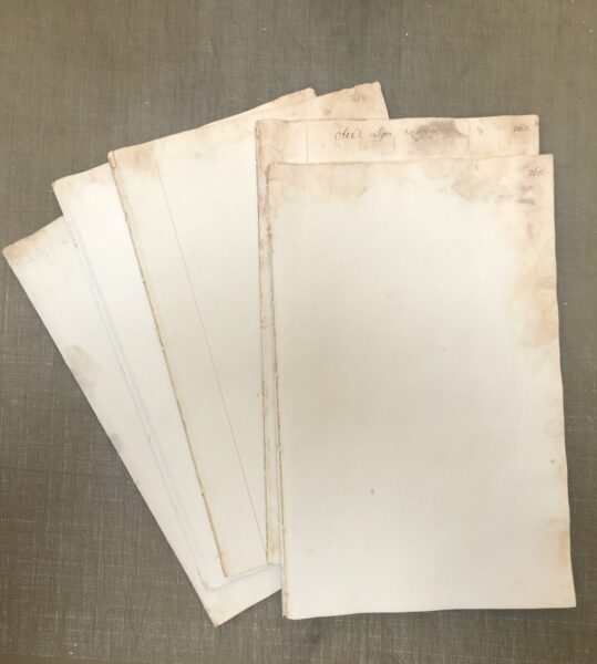 80 vellen 18e eeuws blanco papier van 32,2 × 20,5 cm. Lichte waterschade aan kopkant. Kan gebruikt worden om oud papier in te stukken of voor het vervangen van witte schutbladen bij oude boekbanden.