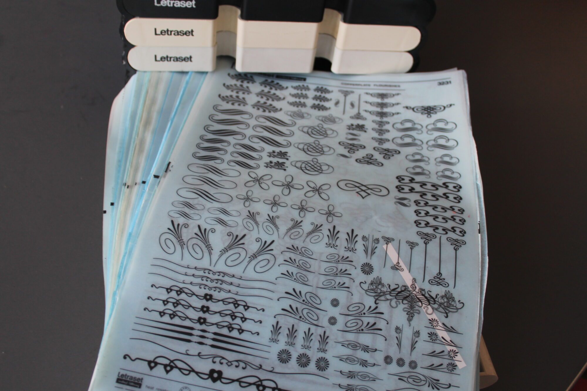 Helemaal vol met vellen Letraset letters en ook rasters, bomen, autos etc.