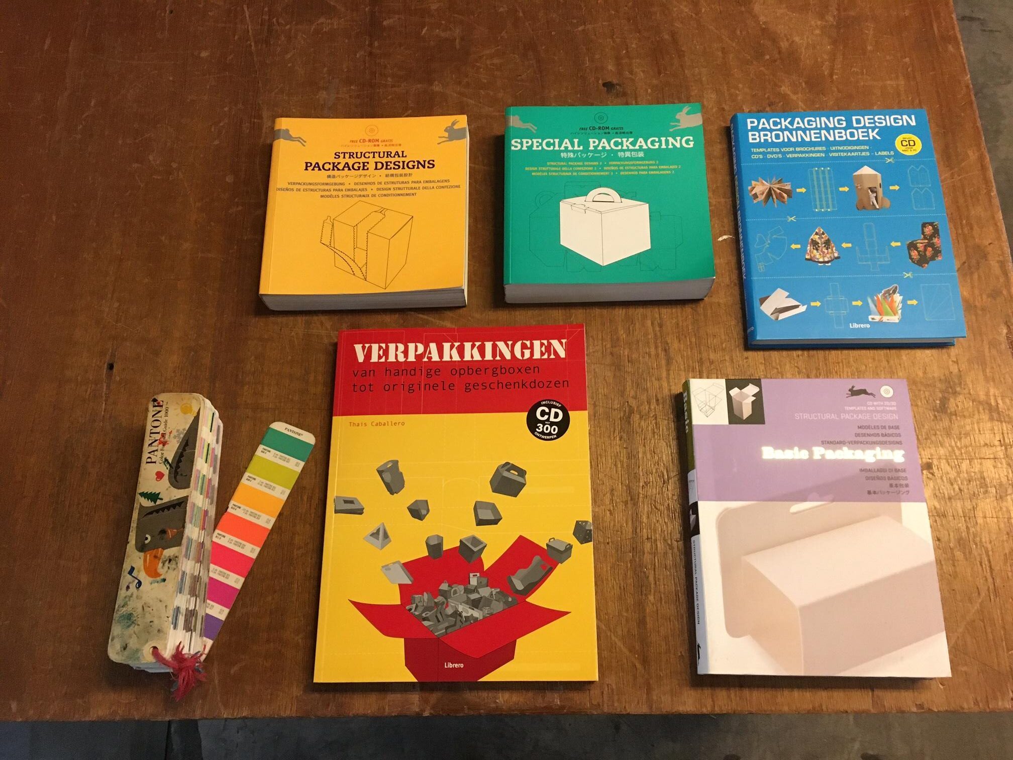 5 Boeken met verpakkingsontwerpen en CD’s met ontwerpen in Illustrator.