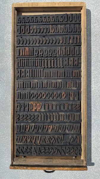 Een letterkast gevuld met een compleet alfabet en een complete cijferreeks houten letters