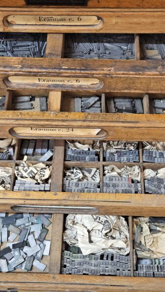 – Inclusief twee houten kasten met letterbakken- Elke lade is gevuld met gesorteerde loden letters, inclusief abstracte vormen en enkele clichés.