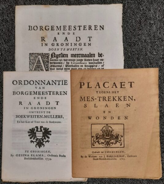 Verspreiding van een Placaet tegen het Mes-Trekken of een Ordonantie omtrent Boekweiten-Mullers worden door ‘publique Trommelslag alomme worden bekent gemaakt’.