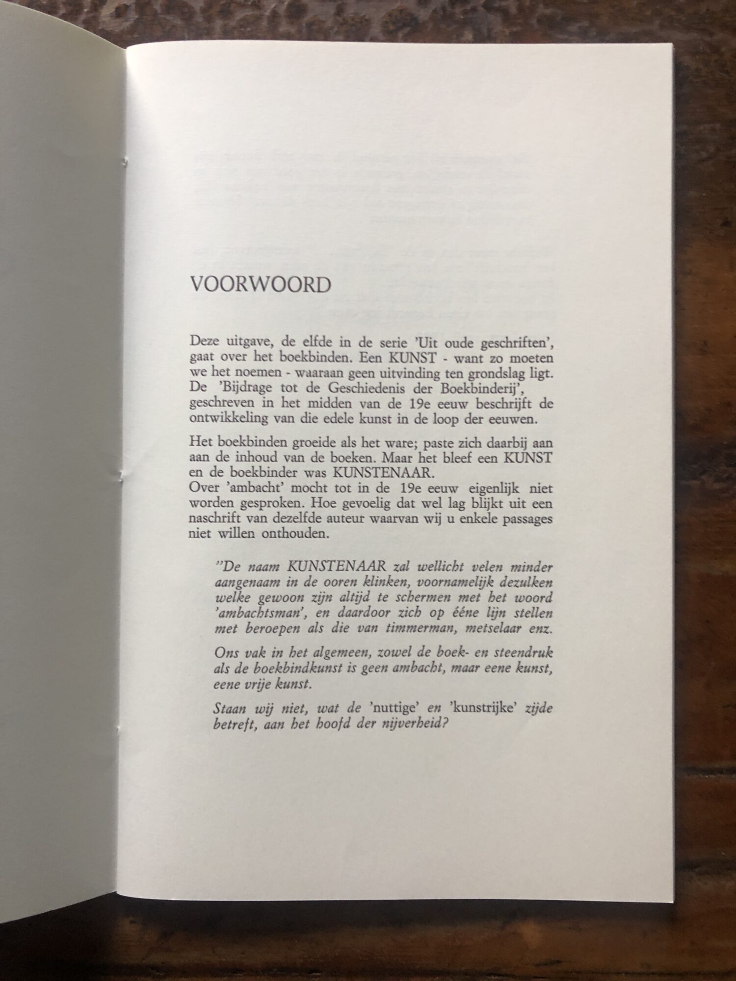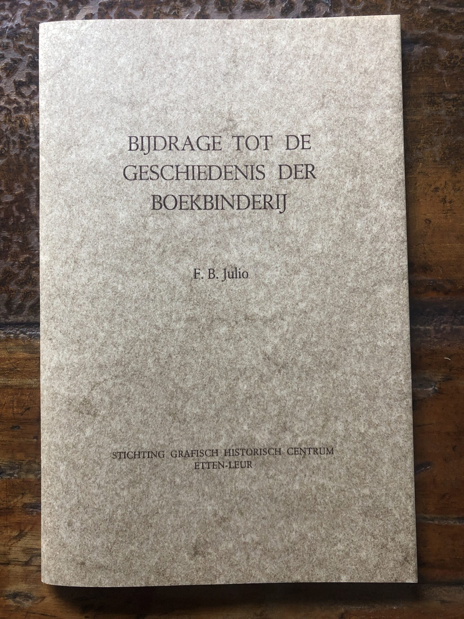 Heruitgave van een tekst van F.B. Julio over de geschiedenis van de boekbinderij, oorspronkelijk gepubliceerd halverwege de 19e eeuw.