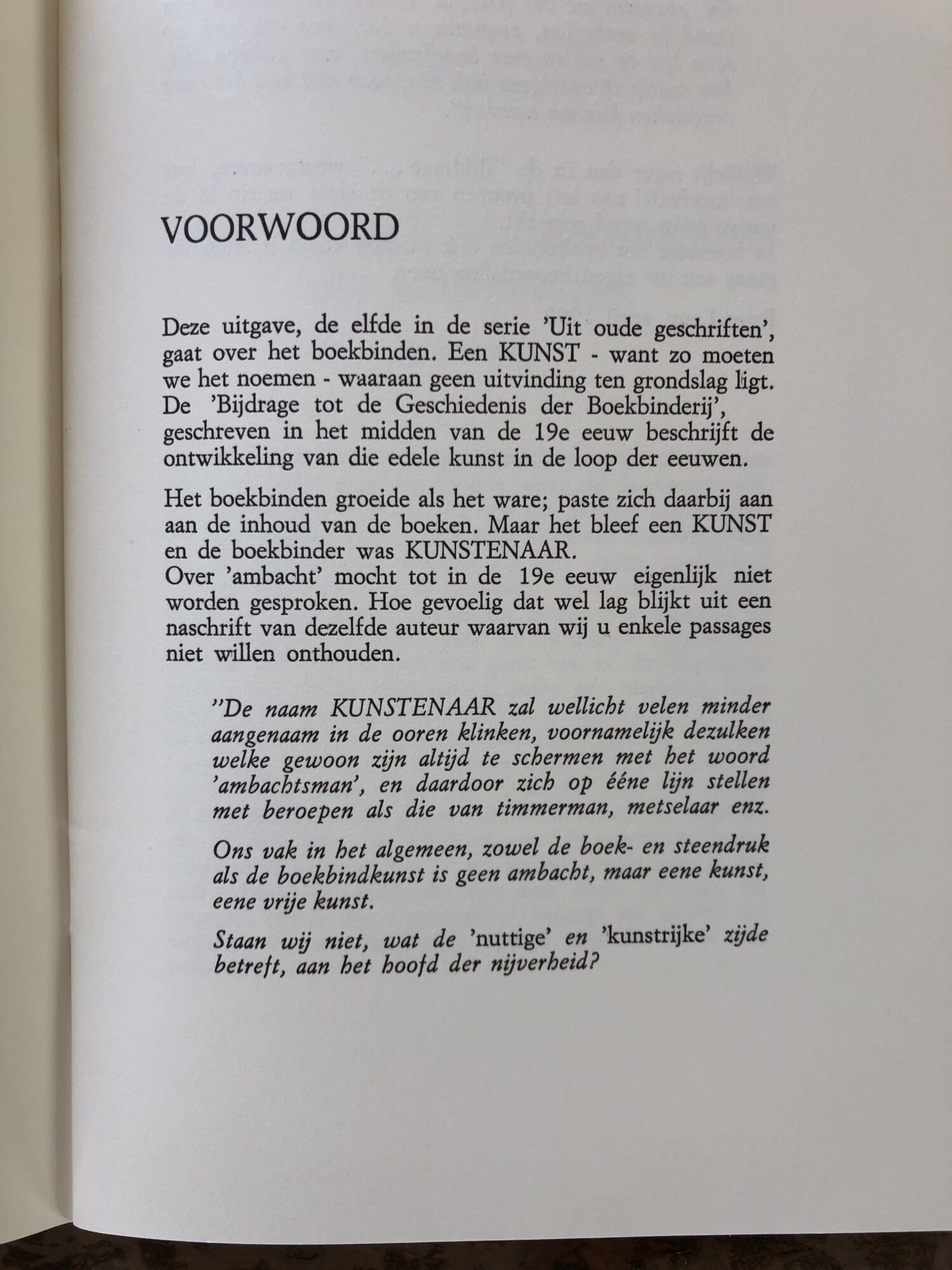 Deze uitgave bevat een herdruk van een 19de eeuwse tekst over (de geschiedenis van) de boekbinderij