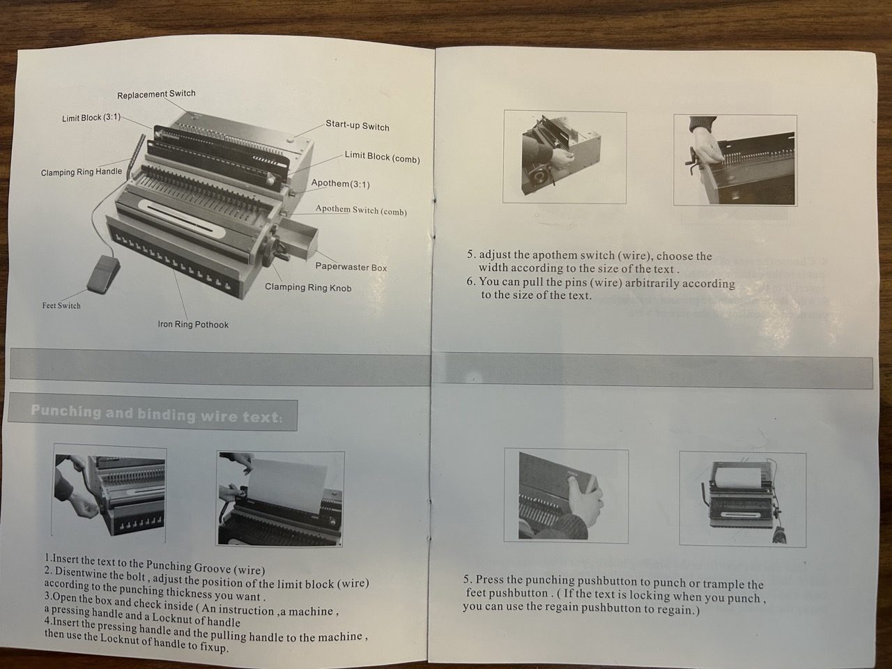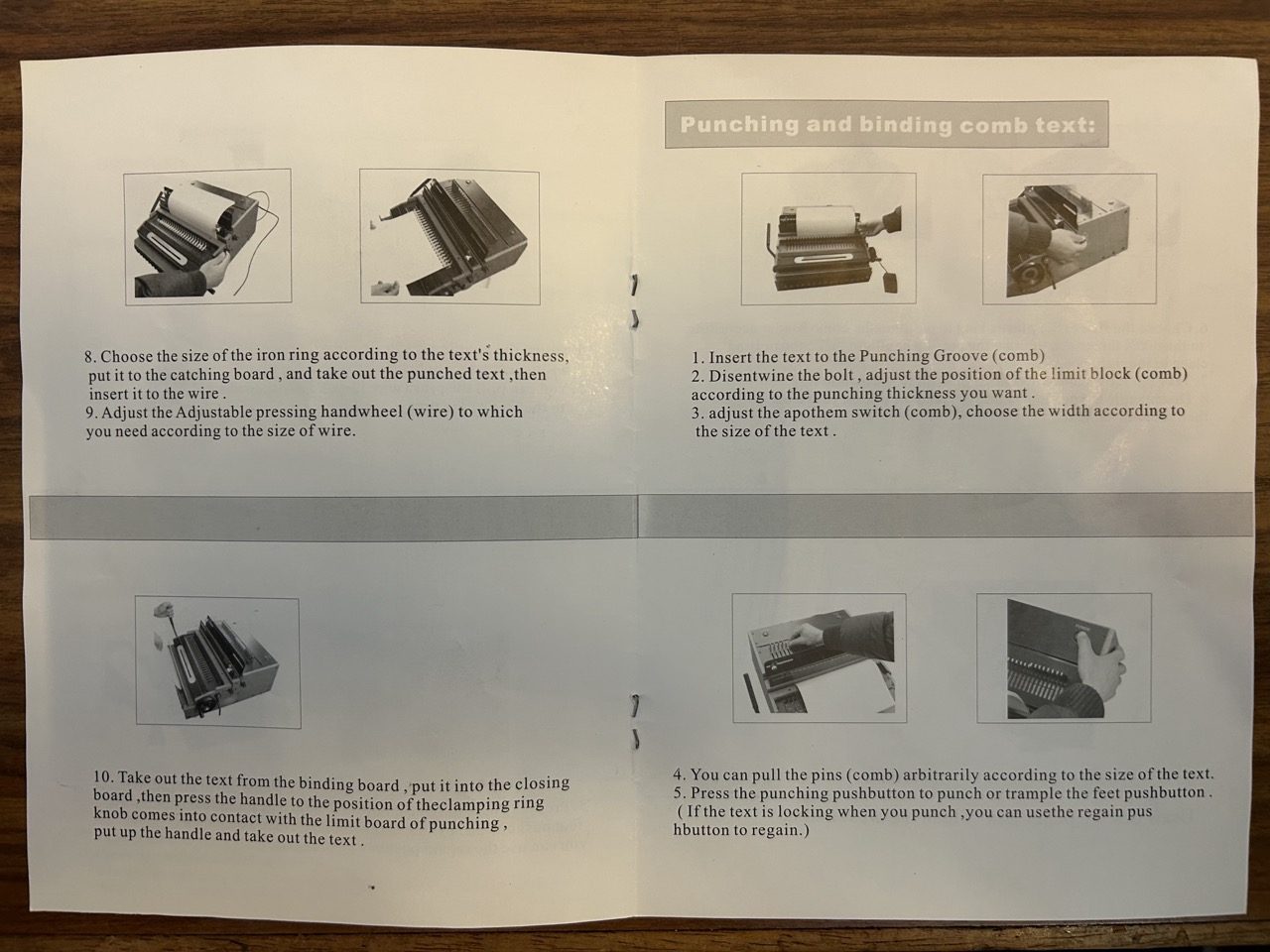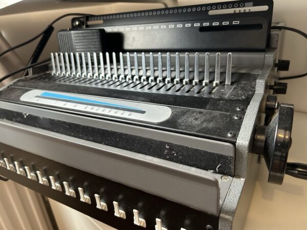 Deze bindmachine ziet er goed uit, is voorzien van voetpedaal en is geschikt voor zowel metalen als voor plastic bindingen, ronde en rechthoekige gaatjes. Er is ook een doos met bindingen bij.