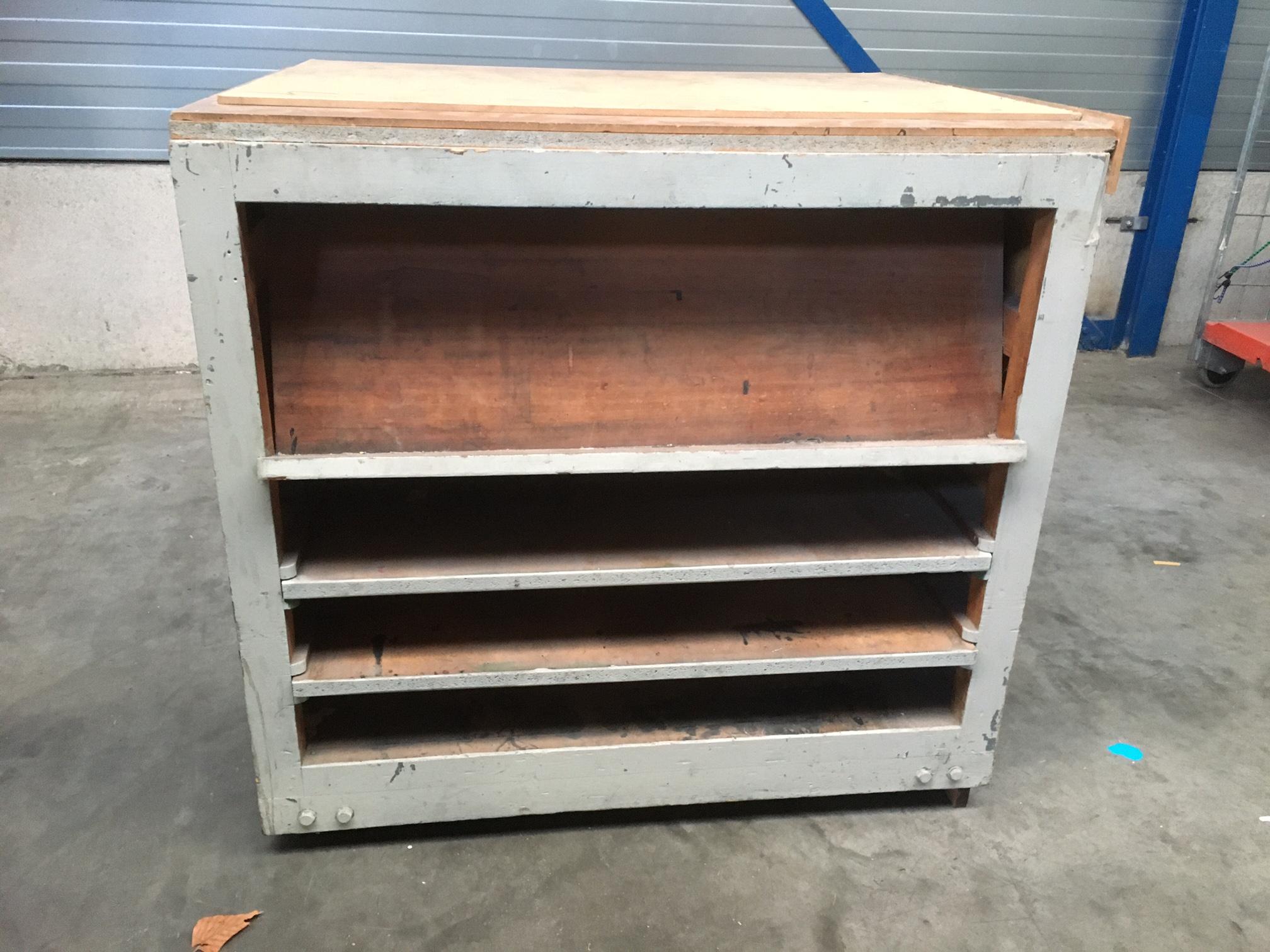 Kast voor in een drukkerij. L × B × H = 96 × 77 × 90 cm.
