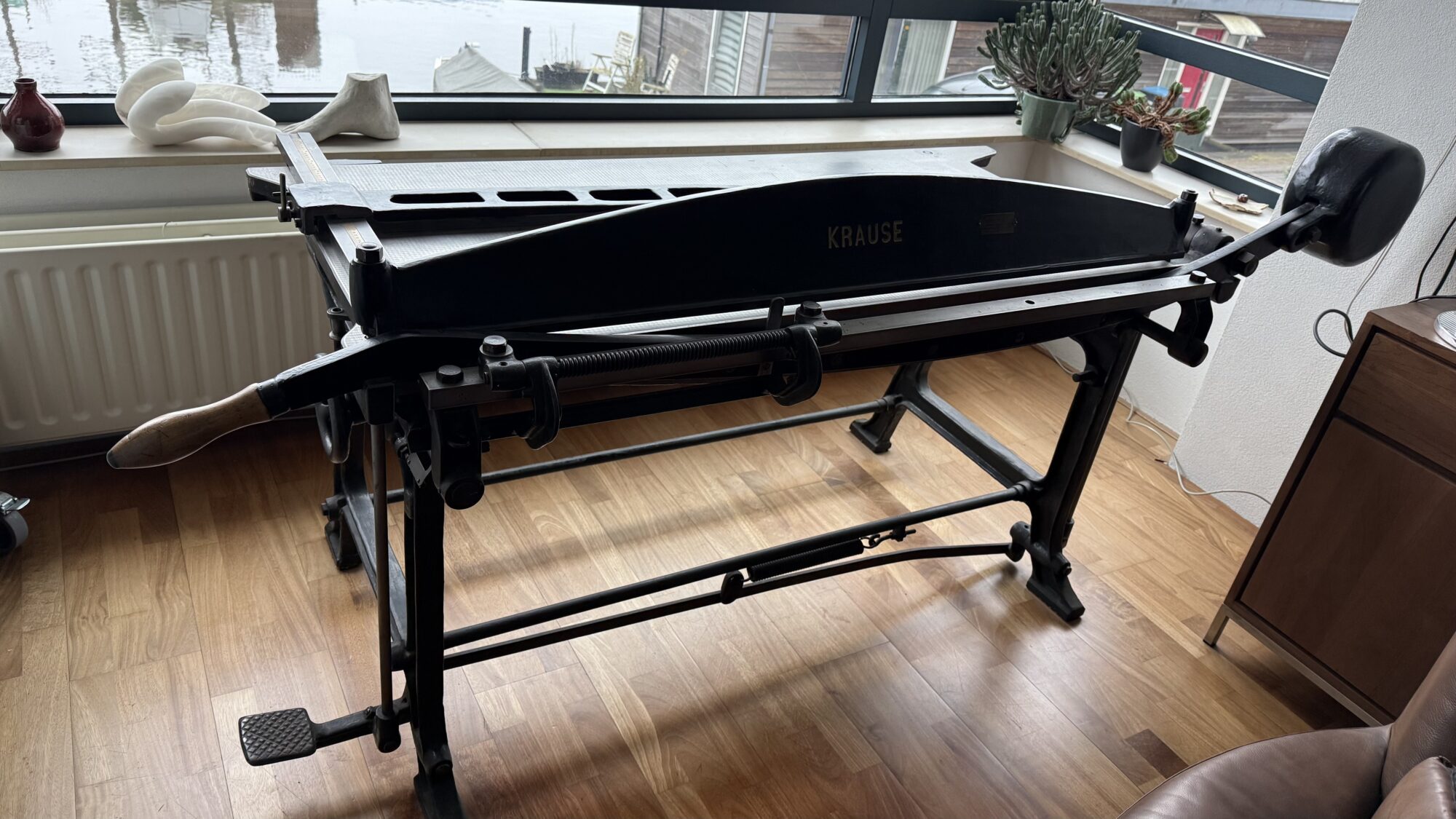 Gereviseerde bordschaar met onlangs geslepen mes. Een joekel. Hier kan je ook linnen van de rol mee snijden. Enorm zwaar. Hij kan natuurlijk uit elkaar, maar dan nog heb je 4 man nodig om het blad te tillen. Of een kraantje en wielen. Ik beschik over motorblokkraan, dan moet u zelf sterke kar meenemen.