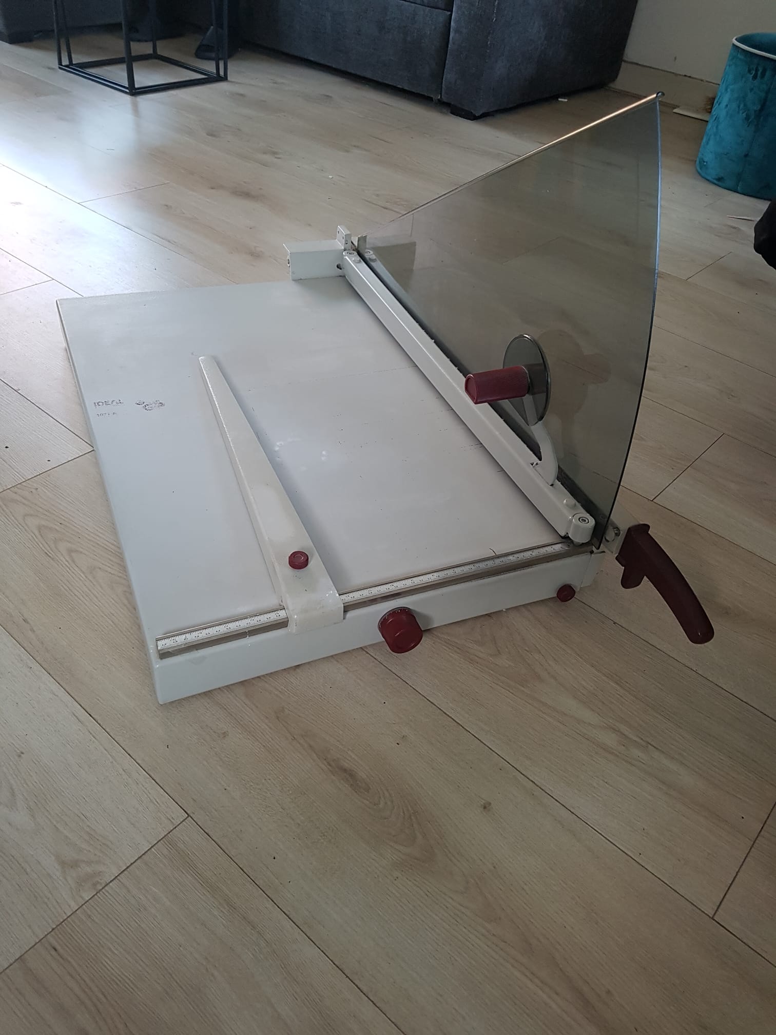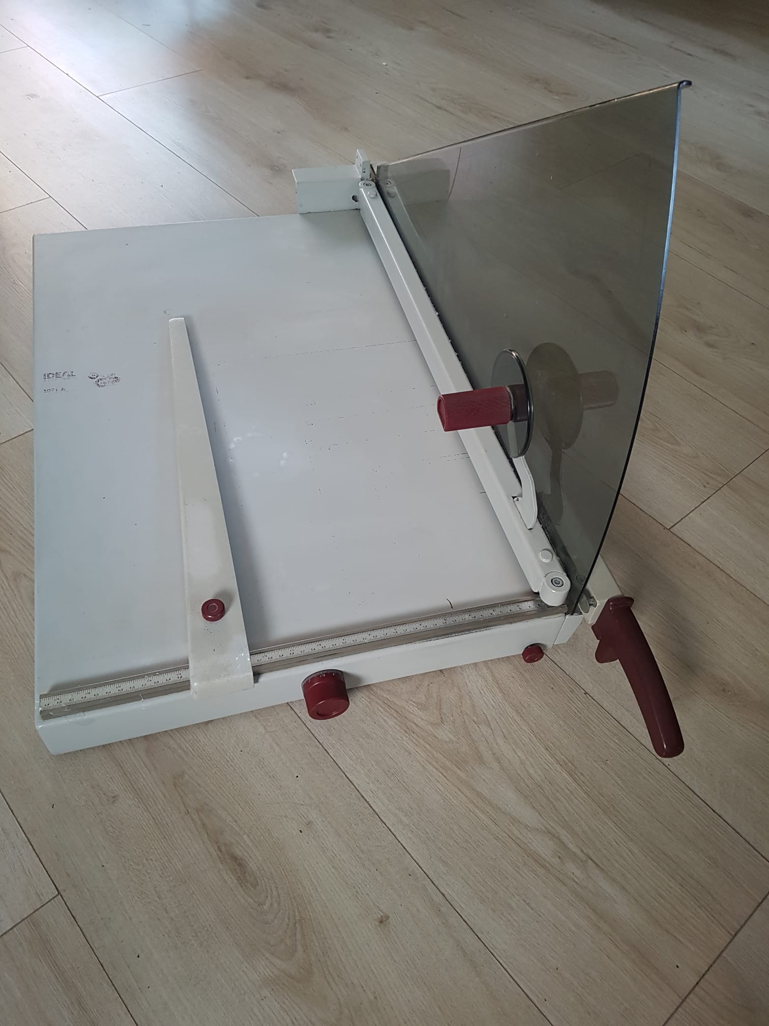 Te koop grote bordschaar van het merk Ideal. Werk nog prima en heeft een goed strak scherp mes. Met verstelbare vooraanleg voor het snijden van smalle stroken. Papierformaat 500 × 700 mm