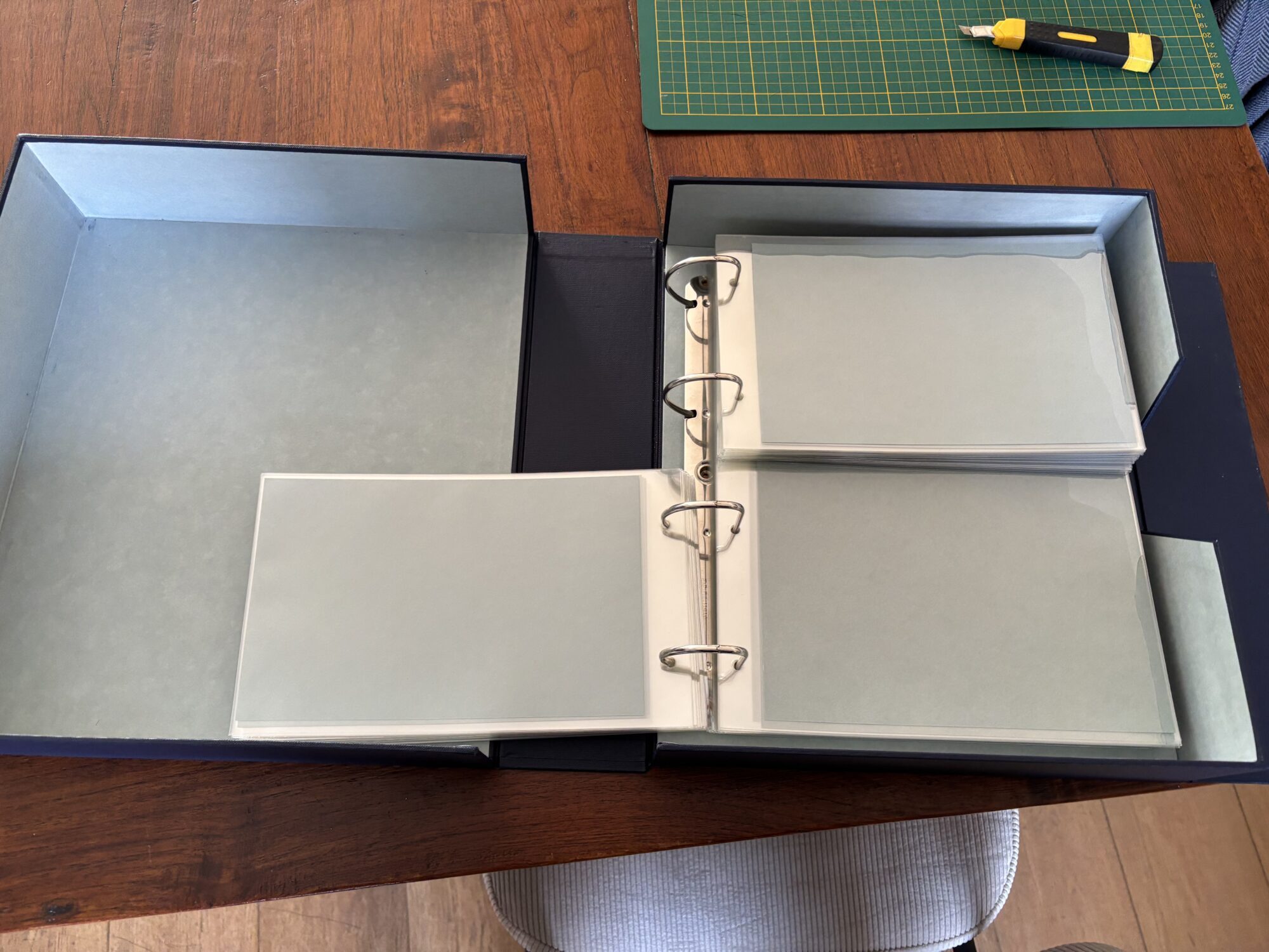 Met 32 doorzichtige inlegbladen met blauw binnenblad ca A4 – Binnenmaat 22.3 – 25 cm / buitenmaat 30.2 – 31 cm