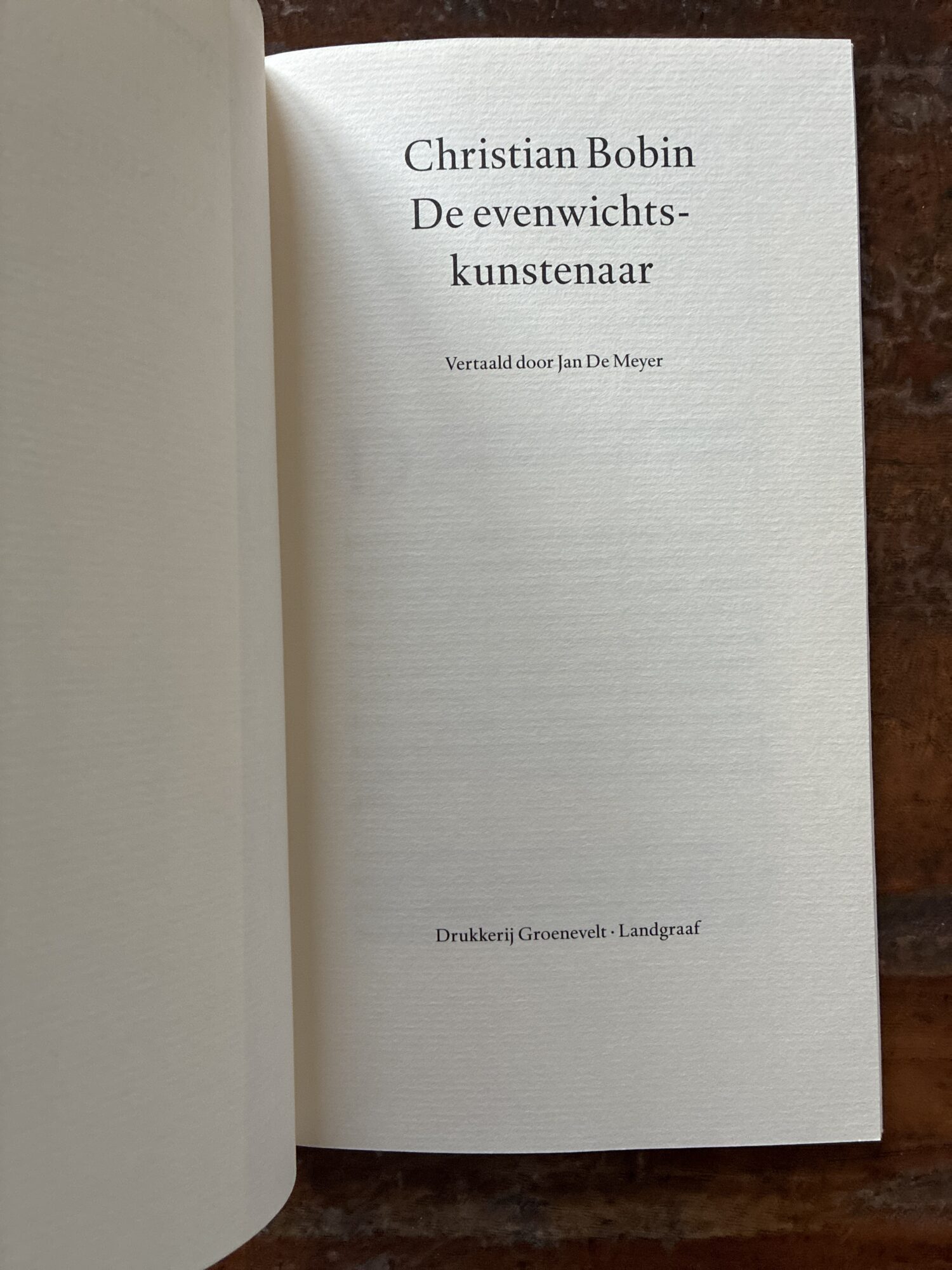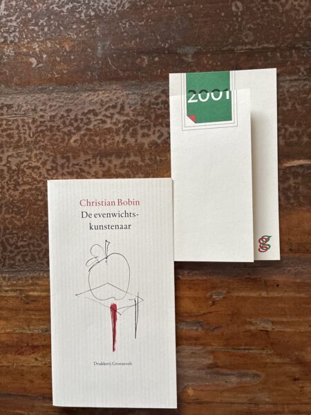 Kort verhaal van Christian Bobin (L’équilibriste), door drukkerij Groenevelt te Landgraaf fraai uitgegeven ter gelegenheid van de jaarwisseling 2000-2001 – ‘voor vrienden en relaties’ (niet in de handel)