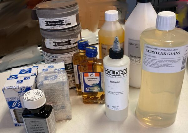 O.a. Etsinkt blikken: 2 × Gutenberg, 2 × Charbonnel 5 × flesje Vernis satin zwart