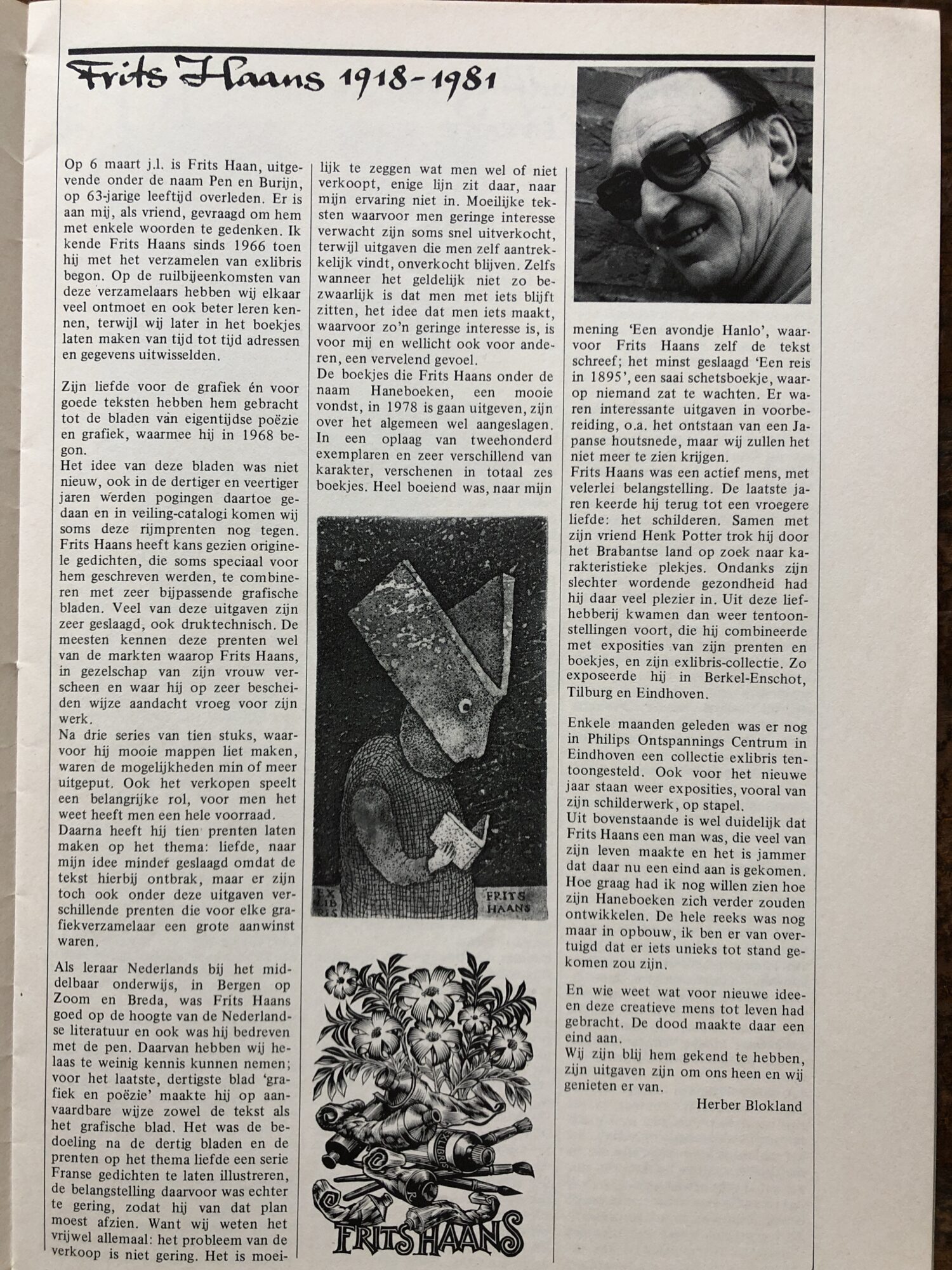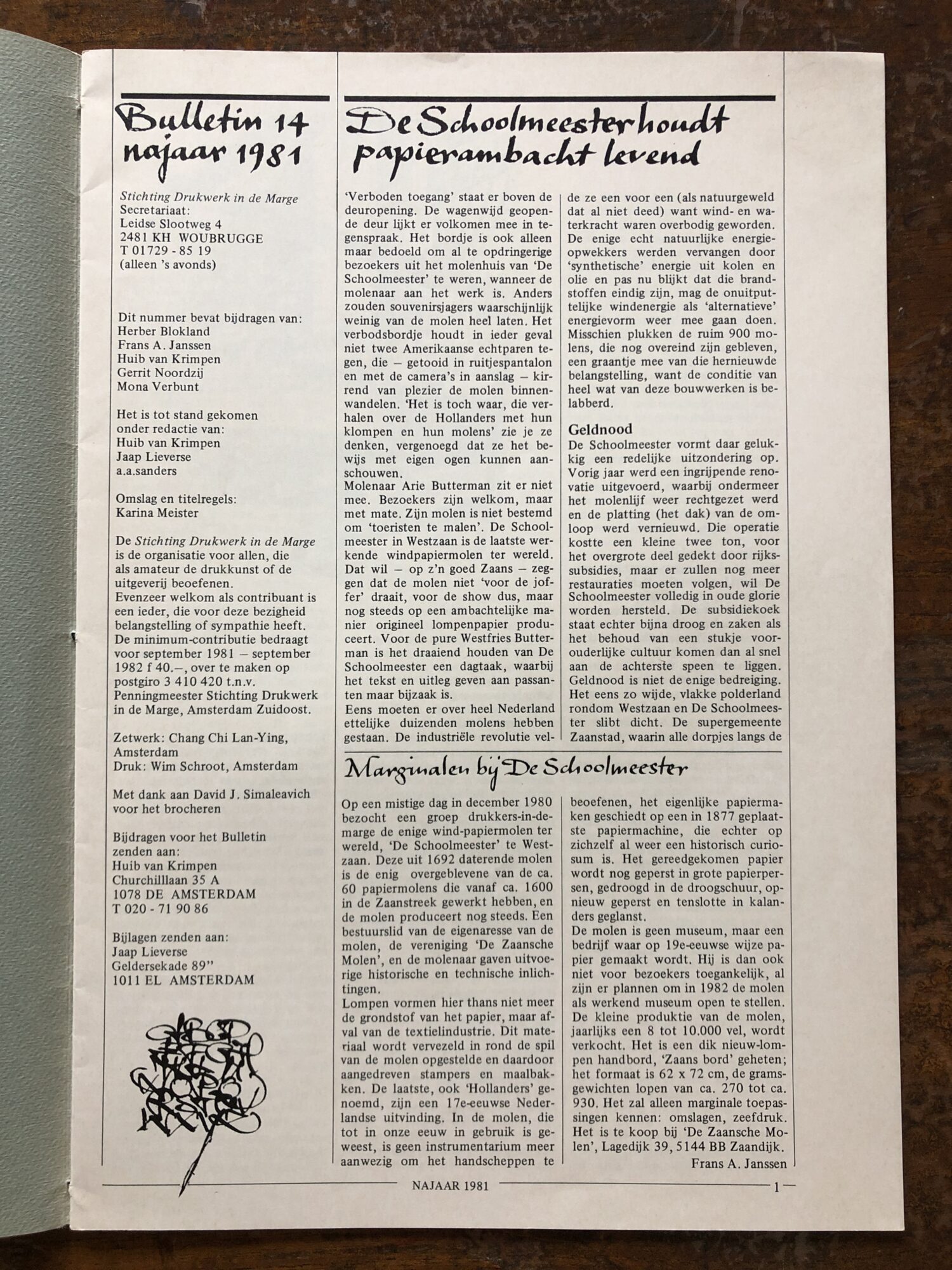 Najaar 1981 verscheen dit veertiende Bulletin van Drukwerk in de Marge; met bijdragen van onder anderen Herber Blokland over de uitgaven van Frits Haans (Pen en Burijn), Huib van Krimpen over de Raamin Presse en Gerrit Noordzij over letterontwerpen; verder onder meer een ‘Korte geschiedenis van de bladwijzer ‘