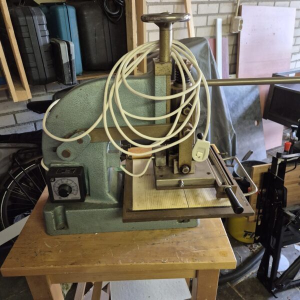 Te koop folieprs voor boekbinderij. Complete set met verguldpers, meerdere lettersets, houder voor 1 of 2 regels, houder voor hele pagina.