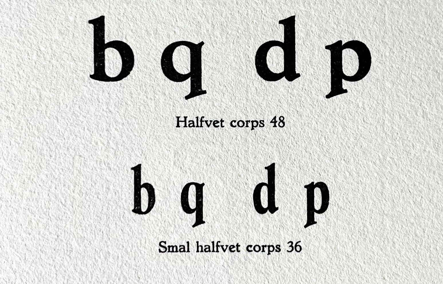– smal halfvet corps 36: 1 × b, d, p en q. Eveneens slechts 1 exemplaar per letter.