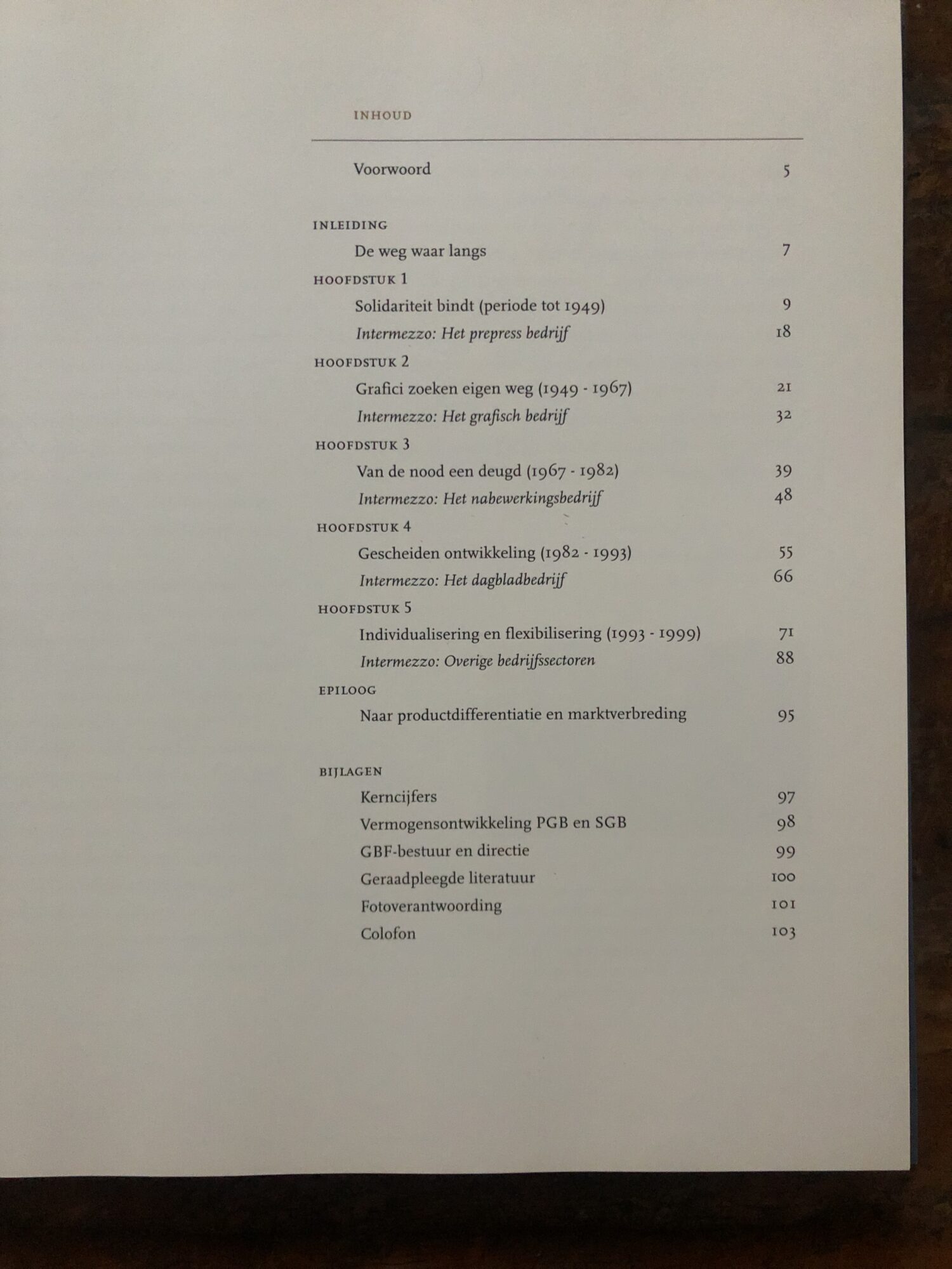 Vijftig jaar Grafische Bedrijfsfondsen, in woord en beeld samengebracht in dit kleurrijke jubileumboek, met mooie foto’s uit het historisch archief van de Bedrijfsfondsen; geeft ook een inkijk in een halve eeuw, soms stormachtige, ontwikkelingen in de grafische bedrijfstak