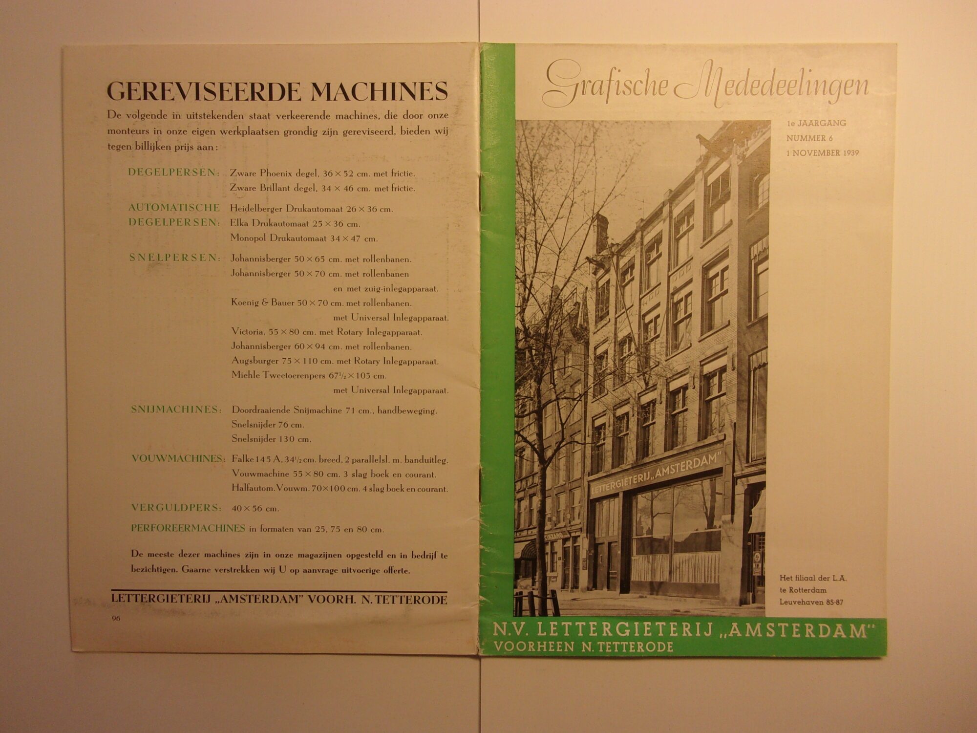 NV Lettergieterij Amsterdam voorheen Tetterode. Uitgave 1e jaargang nummer 6 – 1 november 1939. 16 pagina’s in zwart en steunkleur formaat 18 × 26.5 cm