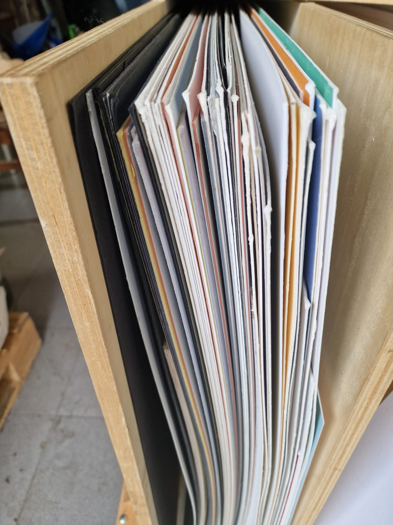 Degelijk grote kaartenkist op zwenkwielen Maten: 123 cm lang × 98 cm hoog × 58 cm breed. Incl grote platen dik karton A1 formaat in verschillende kleuren. De maten van de platen karton zijn 118 × 92 cm.