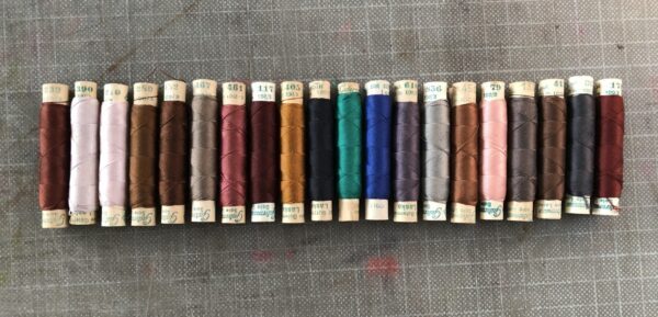 20 niet-aangebroken tubes Gütermann zijde. New old stock zonder lichtschade. Het perfecte garen om de fijne kapitaalbanden te vlechten.