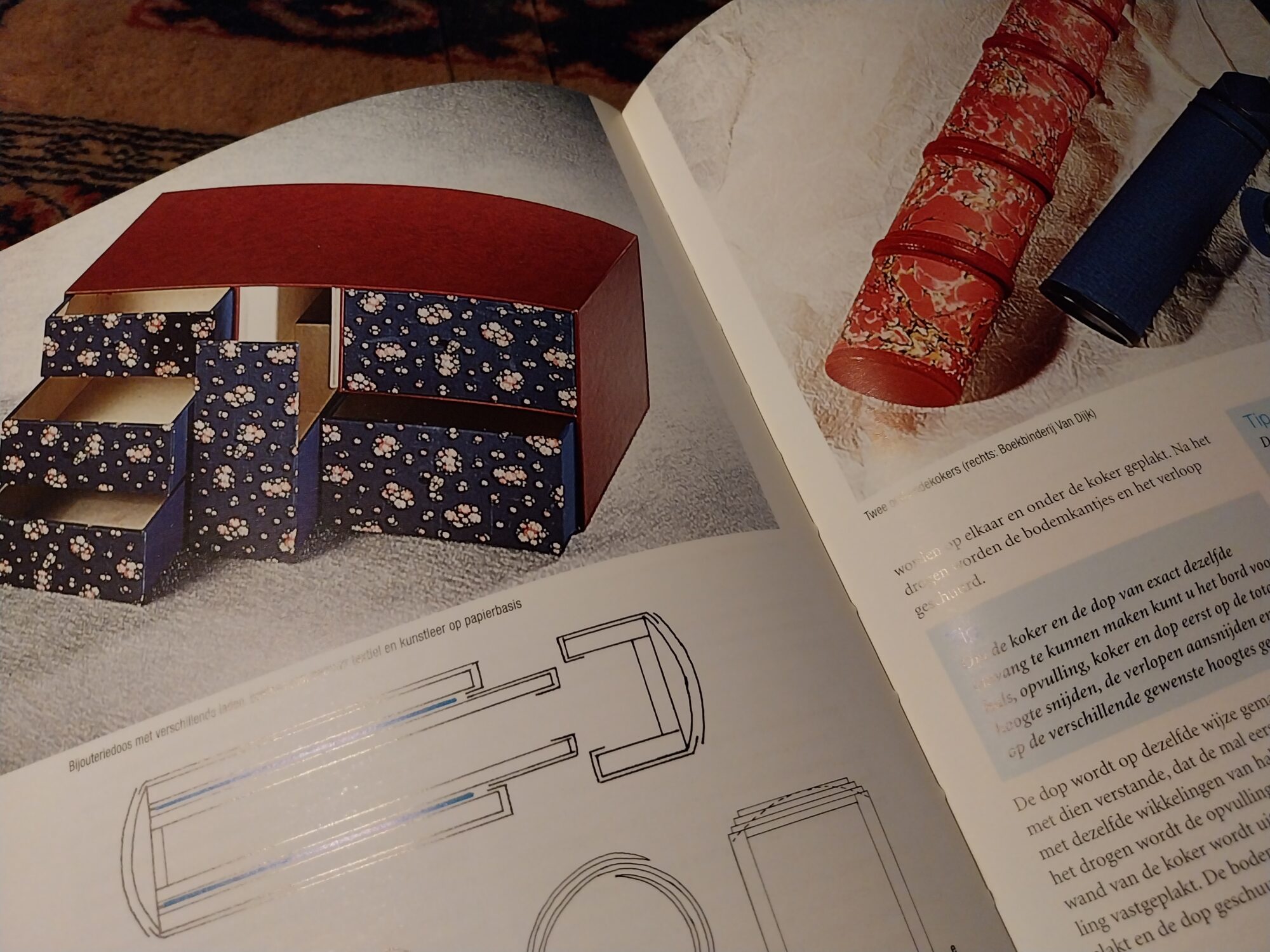 Gereedschappen, kartonnages, herstellen van papier en boekbanden, marmeren, garenloos binden, naaimethodes, lijmen, snijden,.bandzetters, Duitse band, Franse band, vergulden,……