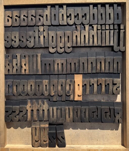 Een compleet alfabet kleine letter, een incompleet alfabet kapitalen (hoofdletter Q ontbreekt) een complete cijferreeks en een aantal leestekens houten letters
