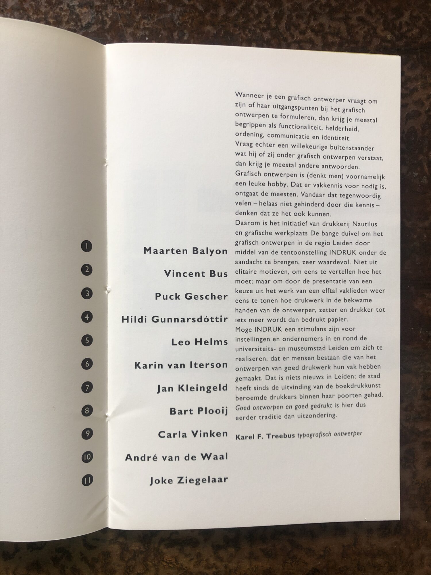 In deze mooi verzorgde uitgave, verschenen bij de gelijknamige tentoonstelling ‘Elf grafische ontwerpers’ (Leiden, september 1993), wordt het werk van elf Leidse grafische ontwerpers voorgesteld aan de hand van een afbeelding en een toelichtende tekst.