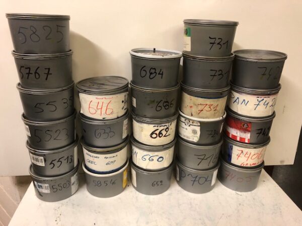 Grote partij inkten (verschillende PMS-kleuren) wegens stopzetting drukkerij (pensioen)