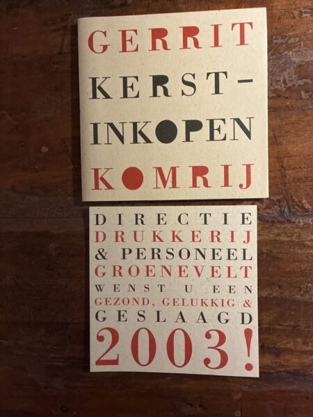 Door drukkerij Groenevelt uitgegeven ter gelegenheid van de jaarwisseling 2002-2003, ‘voor vrienden en relaties’ (niet in de handel).
