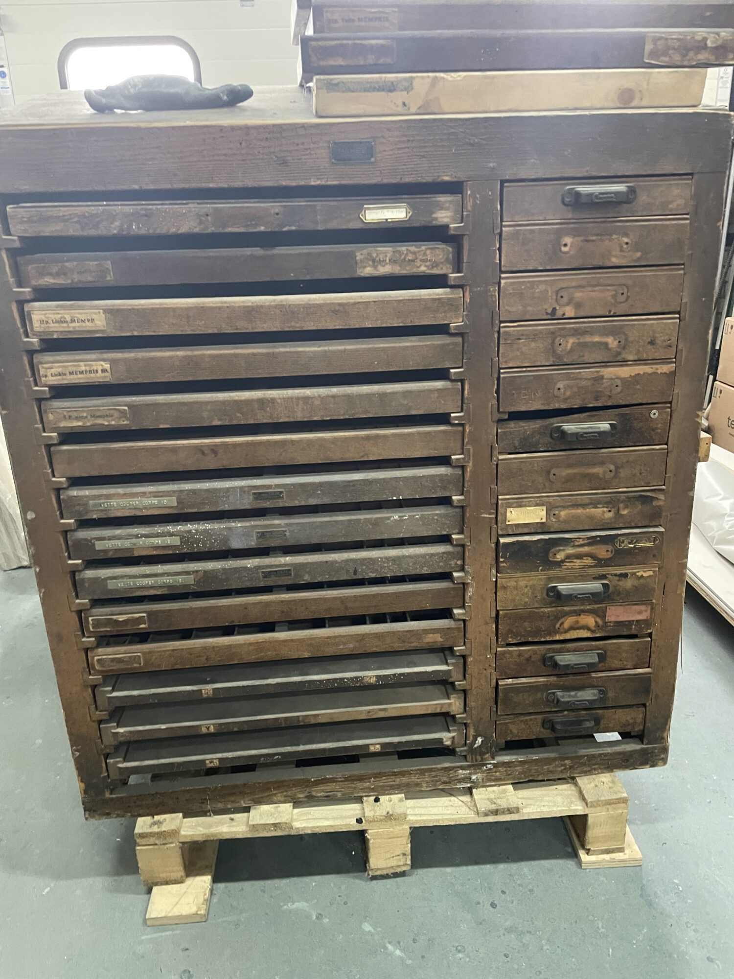 afmetingen: 97,5 × 56 × 114 hoogte achterzijde, voorzijde is 102 cm hoog. incluis alle lades en extra 3 planken. helaas zijn niet alle handvaten aanwezig.