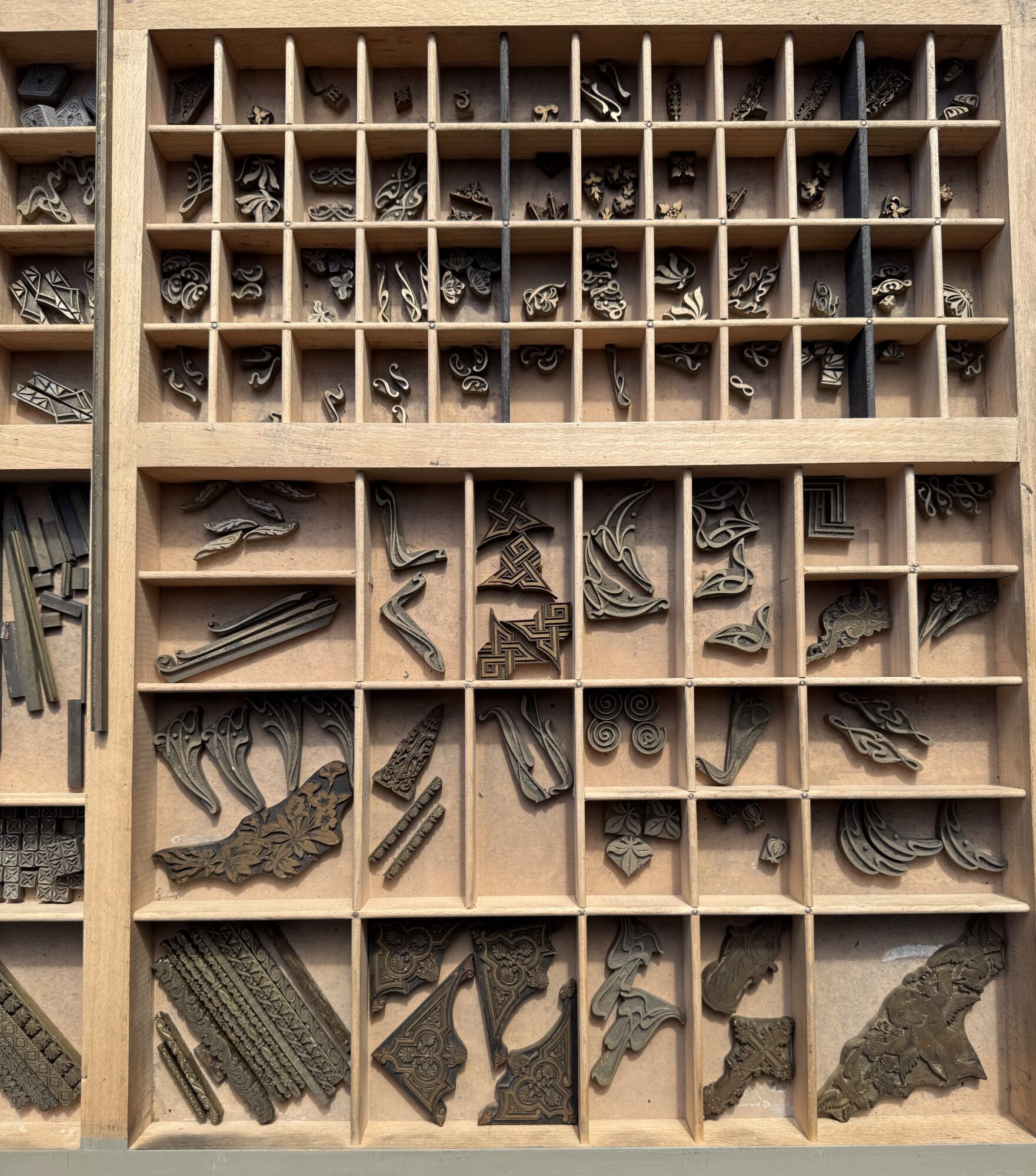 Een letterkast gevuld met messing (koper) ornamenten