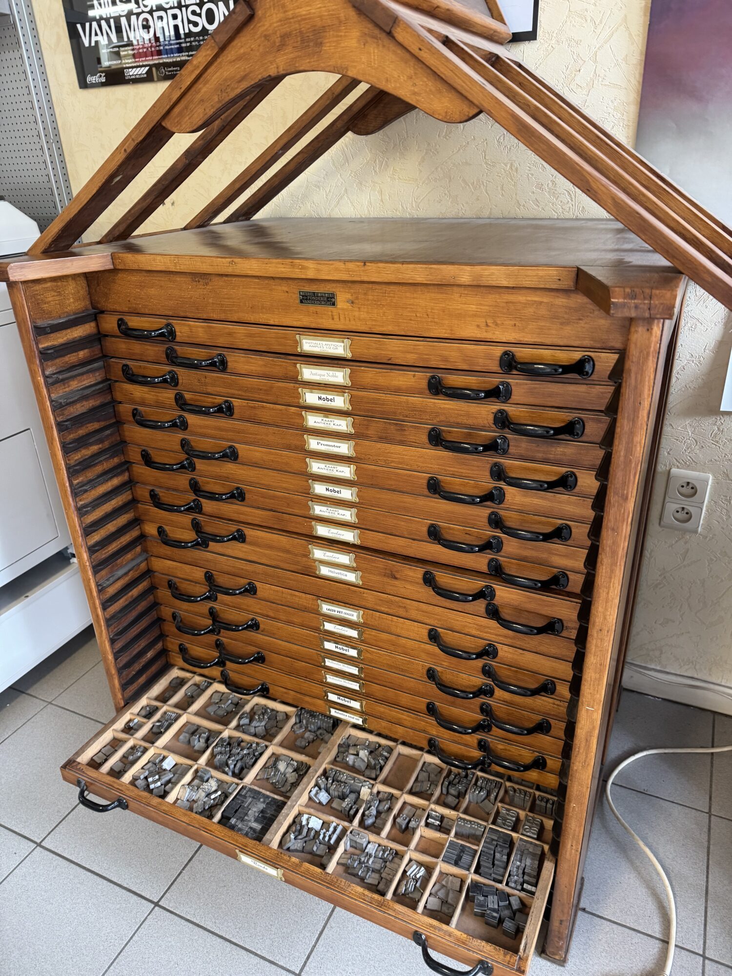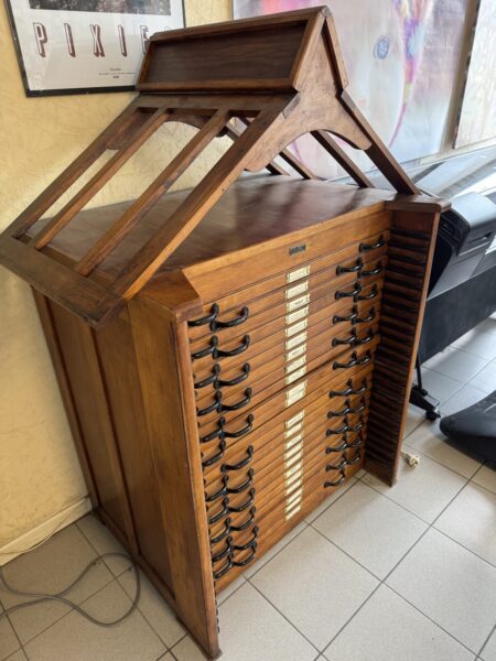 Deze letterkast is een pronkstuk van de drukkerij Jamar. Ze dateert van toen de papa van Guy nog achter de drukpers stond. Het zal een aderlating zijn de drukkerij van Guy te moeten missen. Alleszins succes Guy!