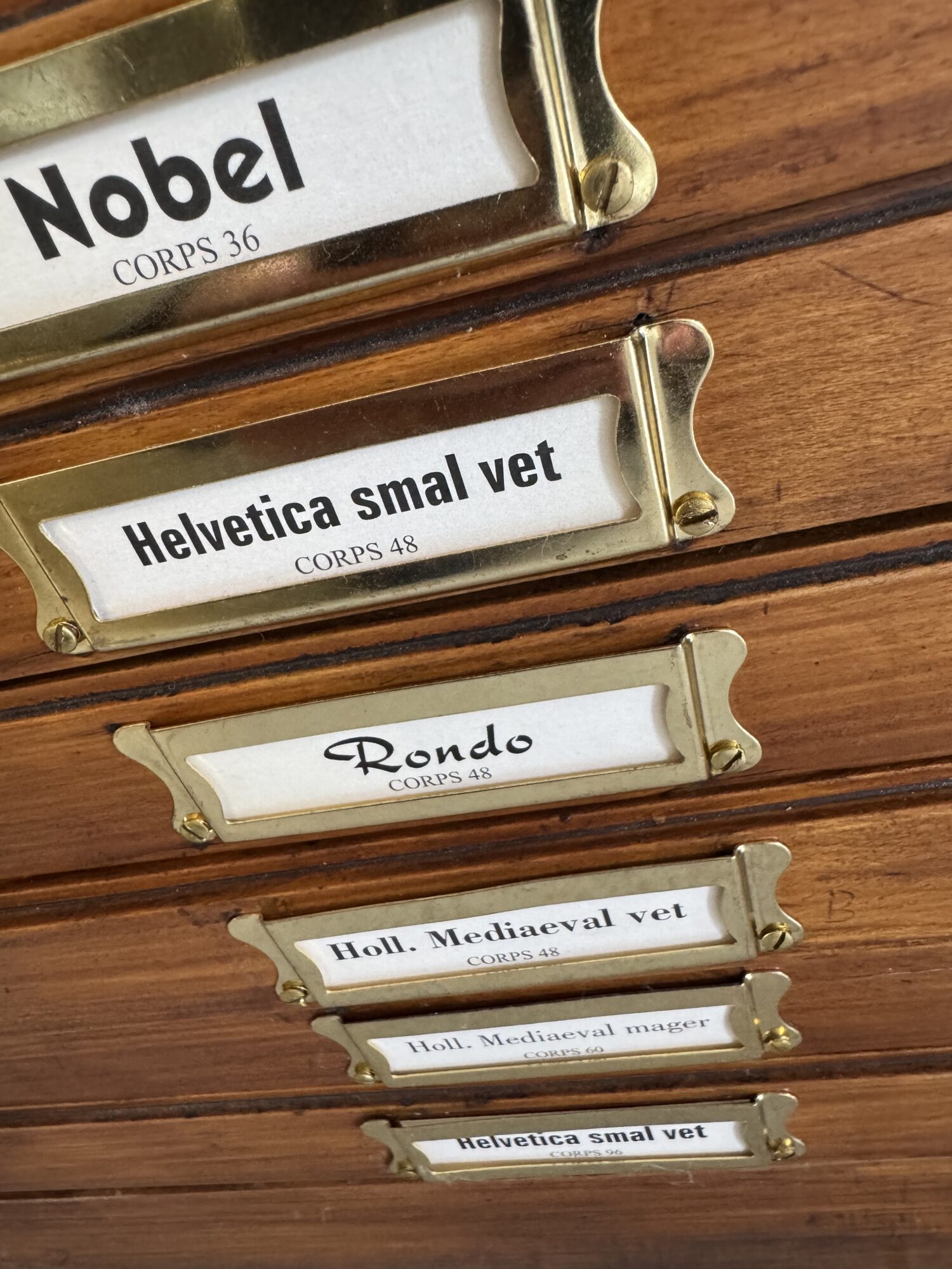 Te koop: Prachtige zetbok met 22 letterkasten, waarvan 21 gevuld met allerlei polissen van 6 tot 96 punt, Belgische hoogte.