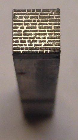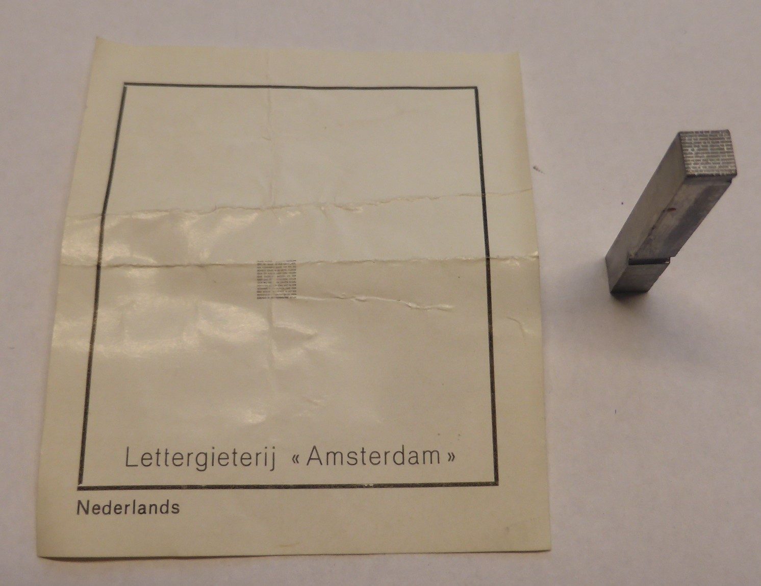 Op het 10-punts (3,76 mm. in het vierkant), 2,5 cm. lange letterstaafje staat het complete ‘Onze Vader’, 380 lettertekens, slechts 0,145 mm. hoog.