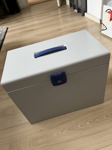 Aangeboden metalen hangmappenbox, inclusief een serie hangmappen Openslaand deksel met plastic handvat, sleuteltje ontbreekt Maten: 36,5 breed × 22 cm diep × 29 cm hoog