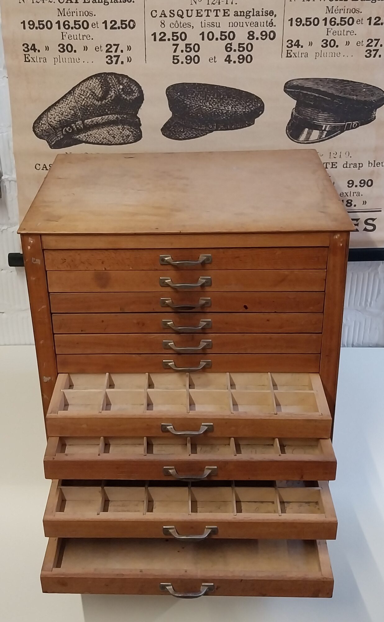 Keurig en stevig ladenkastje bedoeld voor verguldpolissen van een foliepers / prägnant.