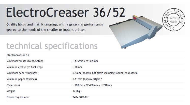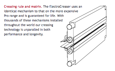 Eenvoudige setup. Voorzien van 2 verplaatsbare aanlegpunten voor het snel en accuraat aanmaken van bvb 3-luikjes. Mechanisme is voorzien van 2 bieglijn breedtes – 1,2 en 1,6 mm – afhankelijk van de te verwerken papier grammage en is eenvoudig in te stellen via een draaiwieltje. Idiot proof en life-time uw partner in de grafische studio.