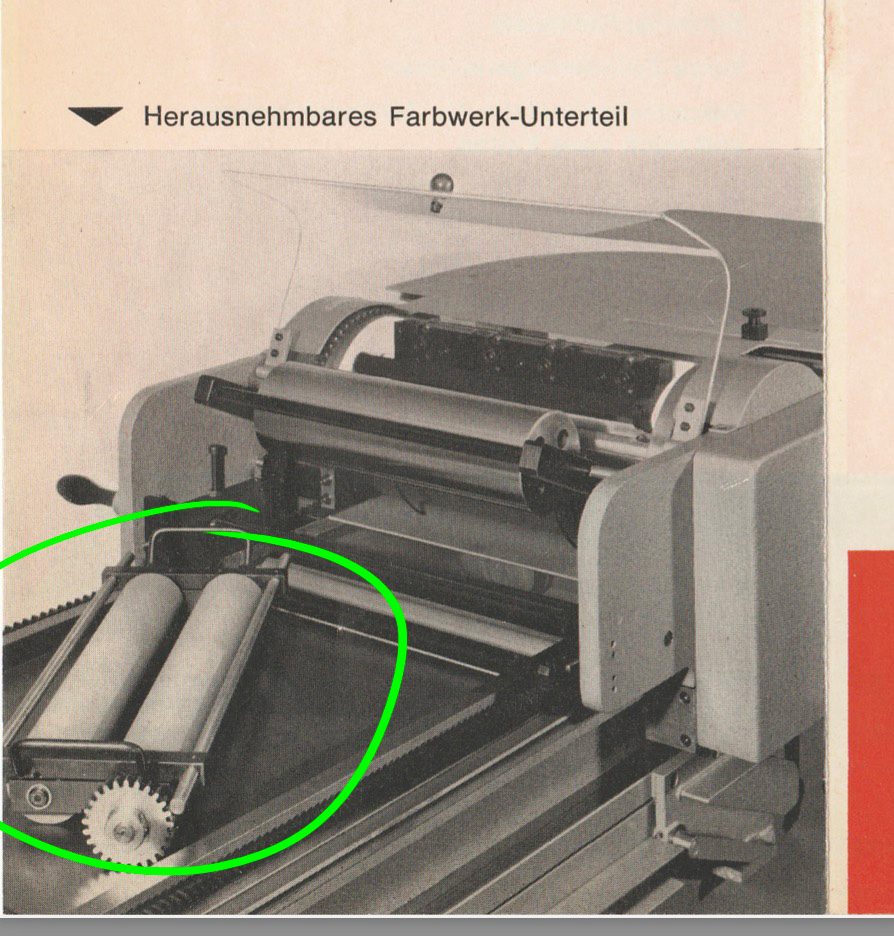 Hij verkeert in gemiddelde staat, maar belangrijker nog: hij mist de twee inktrollen, het metalen frame dat ze op hun plaats houdt en de reinigingslade (die in het frame schuift, onder de rekken).