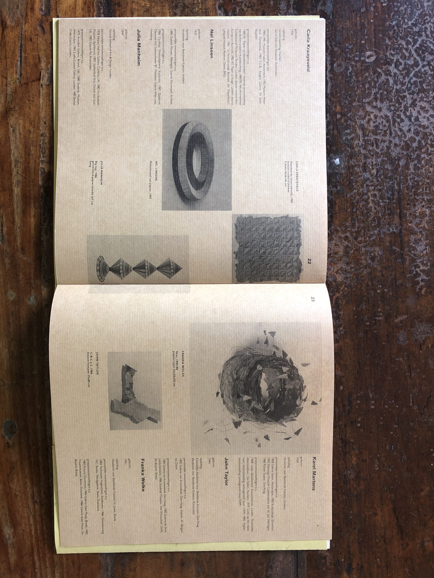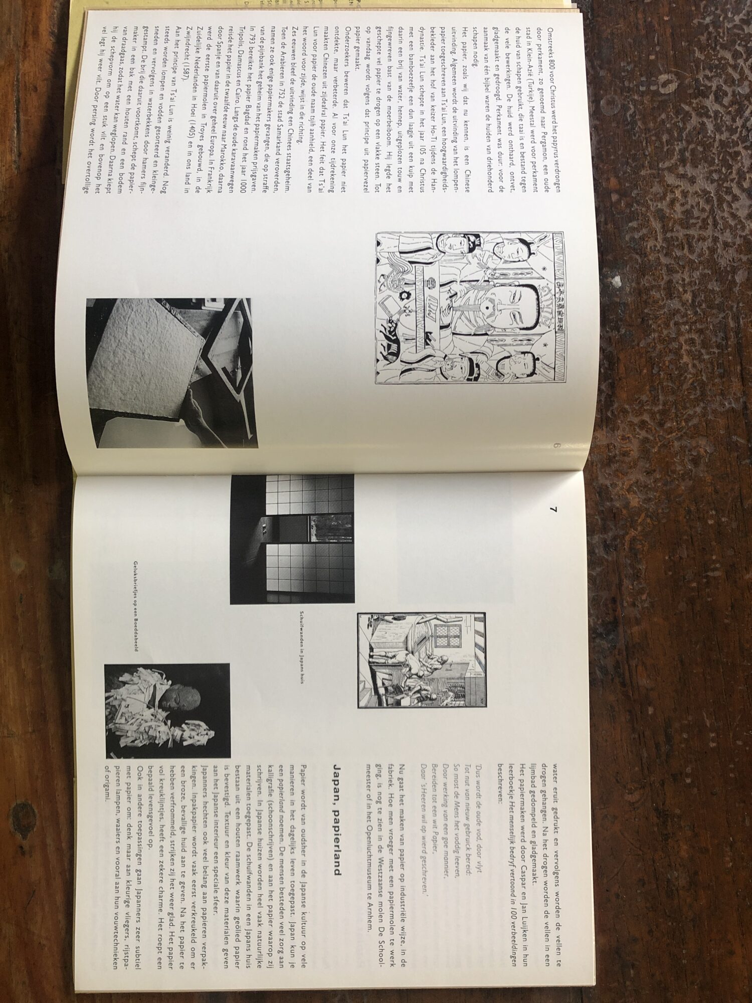 23 pag., geniet, geïllustreerd, met een inleiding over de geschiedenis van het papier en een catalogusdeel met beschrijving van de geëxposeerde kunstvoorwerpen van papier